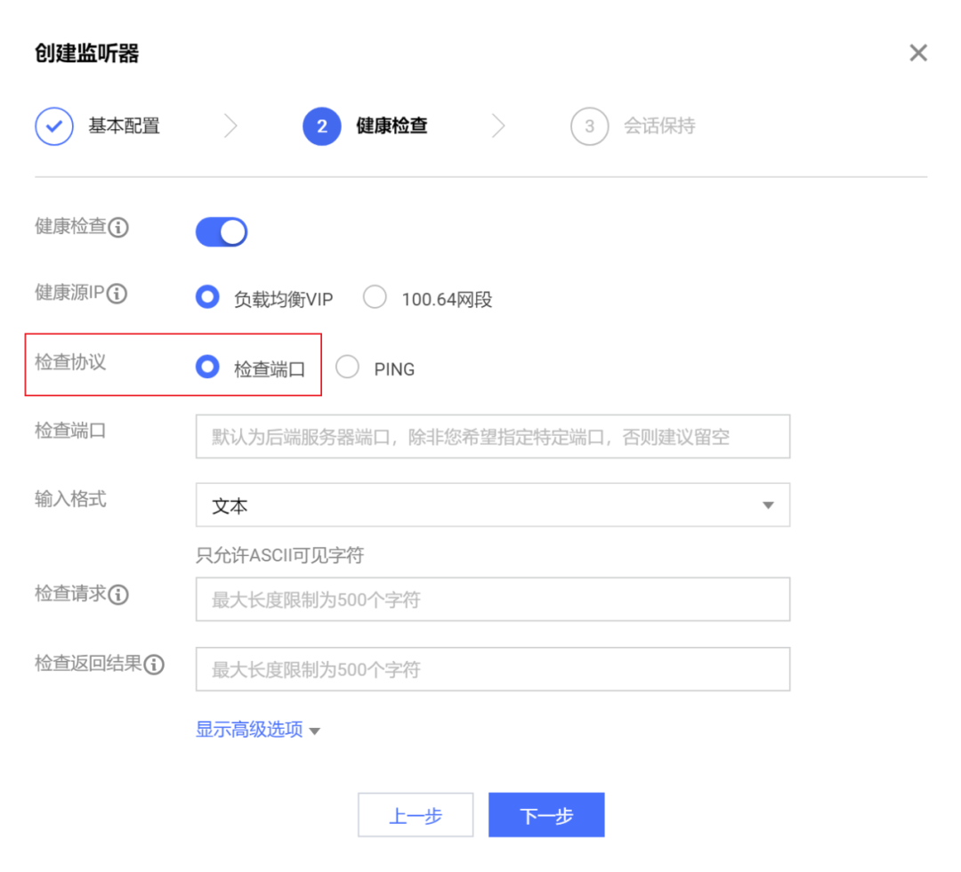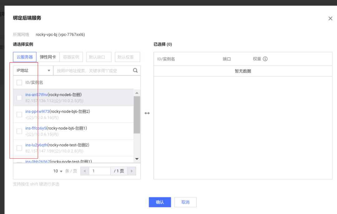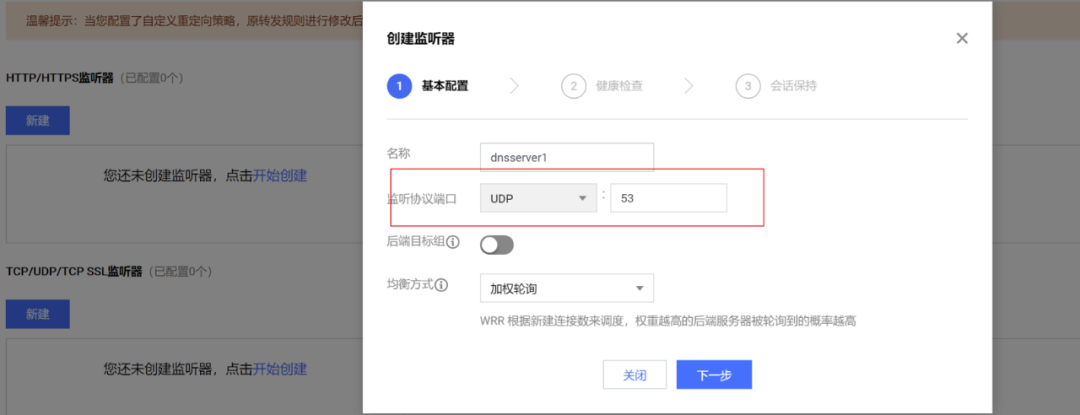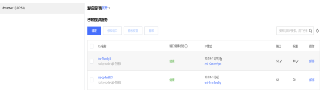 新建内网LB,配置监听端口为UDP:53,加权轮询。