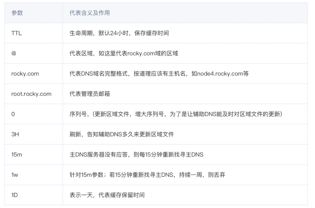 [root@node4 ~]# cat /etc/named.conf//// named.conf//// Provided by Red Hat bind package to configure the ISC BIND named(8) DNS// server as a caching only nameserver (as a localhost DNS resolver only).//// See /usr/share/doc/bind*/sample/ for example named configuration files.//// See the BIND Administrator's Reference Manual (ARM) for details about the// configuration located in /usr/share/doc/bind-{version}/Bv9ARM.htmlacl "trusted-recursion" { # 设置acl localhost; 10.0.0.0/16;};options { listen-on port 53 { any; }; #设置监听端口,也可写具体的网段 listen-on-v6 port 53 { any; }; directory "/var/named"; dump-file "/var/named/data/cache_dump.db"; statistics-file "/var/named/data/named_stats.txt"; memstatistics-file "/var/named/data/named_mem_stats.txt"; recursing-file "/var/named/data/named.recursing"; secroots-file "/var/named/data/named.secroots"; allow-query { any; }; #开放查询  allow-recursion { trusted-recursion; }; #指定允许哪些主机可以从缓存中获取答案。 allow-query-cache { trusted-recursion; }; # 指定允许那些主机可以通过本服务器进行递归查询。 /* - If you are building an AUTHORITATIVE DNS server, do NOT enable recursion. - If you are building a RECURSIVE (caching) DNS server, you need to enable recursion. - If your recursive DNS server has a public IP address, you MUST enable access control to limit queries to your legitimate users. Failing to do so will cause your server to become part of large scale DNS amplification attacks. Implementing BCP38 within your network would greatly reduce such attack surface */ recursion yes; dnssec-enable no; dnssec-validation no; # 关闭dnssec安全验证 /* Path to ISC DLV key */ #bindkeys-file "/etc/named.root.key"; managed-keys-directory "/var/named/dynamic"; pid-file "/run/named/named.pid"; session-keyfile "/run/named/session.key"; forwarders { 183.60.83.19; # 腾讯云VPCGW DNS地址 183.60.82.98; # 腾讯云VPCGW DNS地址 };};logging { channel default_debug { file "data/named.run"; severity dynamic; };};zone "." IN { type hint; file "named.ca";};#include "/etc/named.rfc1912.zones";include "/etc/named.root.key";zone "rocky.com" { # 域名 type master; #主DNS file "dynamic/rocky.com.zone"; # zone file path #正向区域文件 notify yes;};zone "6.0.10.in-addr.arpa" in { type master; file "dynamic/6.0.10.in-addr.arpa.zone"; #反向区域文件 notify yes;};
