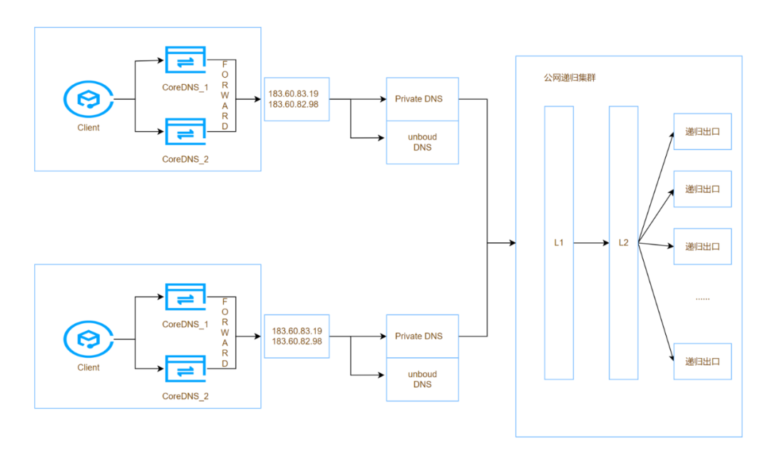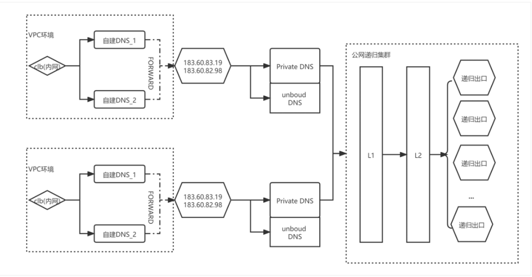 • Client => CLB=>自建DNS1 =>转发至183 DNS => Private DNS =>公网递归DNS