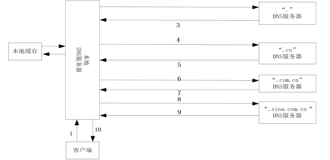 • Step-10:本地DNS服务器收到www.sina.com.cn的解析后,先本地缓存一份,同时将其结果返回给客户机,这样就完成一次域名解析过程。