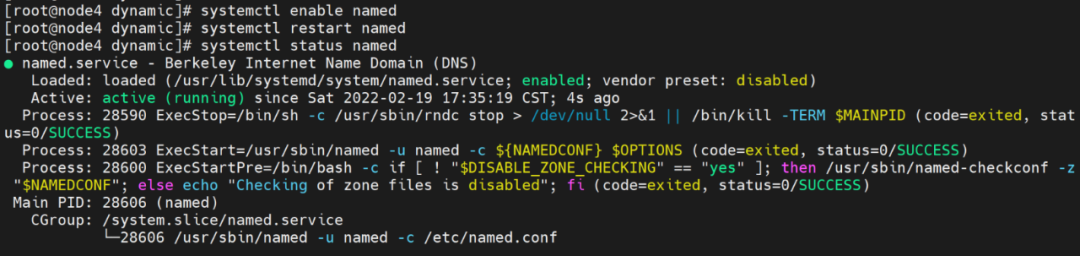 [root@node1 ~]# systemctl status coredns coredns.service - CoreDNS DNS server   Loaded: loaded (/usr/lib/systemd/system/coredns.service; disabled; vendor preset: disabled)   Active: active (running) since Tue 2022-02-15 16:13:43 CST; 4s ago     Docs: https://coredns.io Main PID: 30288 (coredns)   CGroup: /system.slice/coredns.service           └─30288 /usr/bin/coredns -conf=/etc/coredns/Corefile