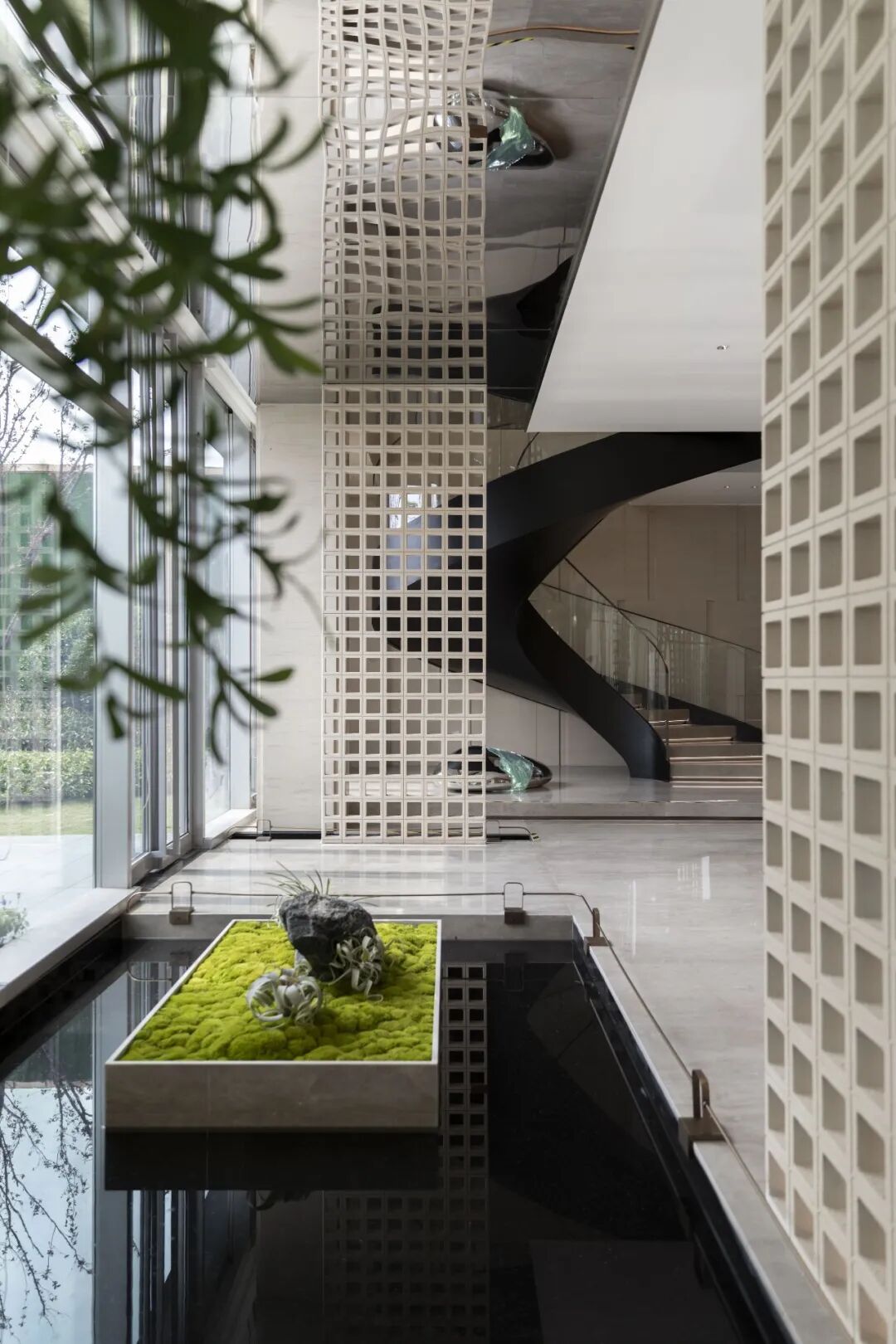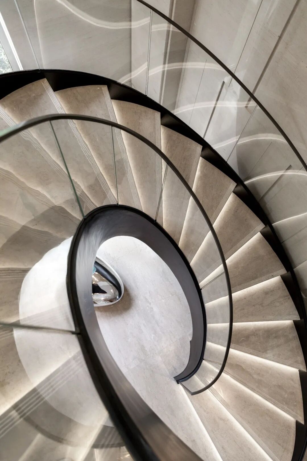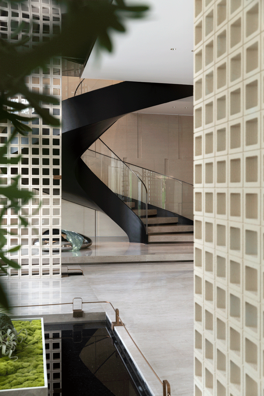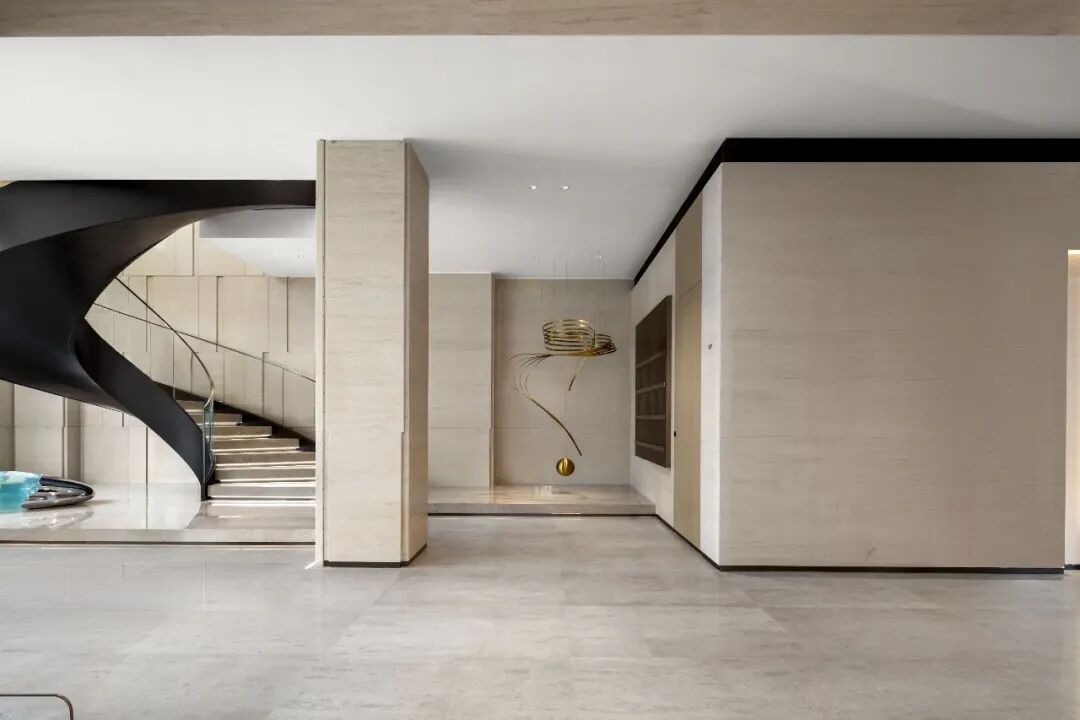 项目的旋转楼梯矗立于廊道尽头,黑色的楼梯将墙面作为背景,宛如画境跃然纸上。楼梯下方的艺术装置安然位于下侧,金属材质映射周围空间,水晶材质晶莹剔透。