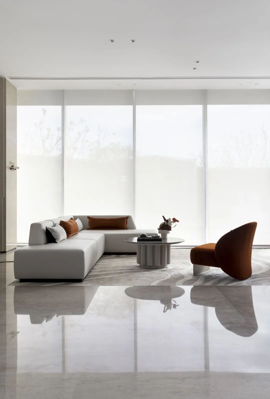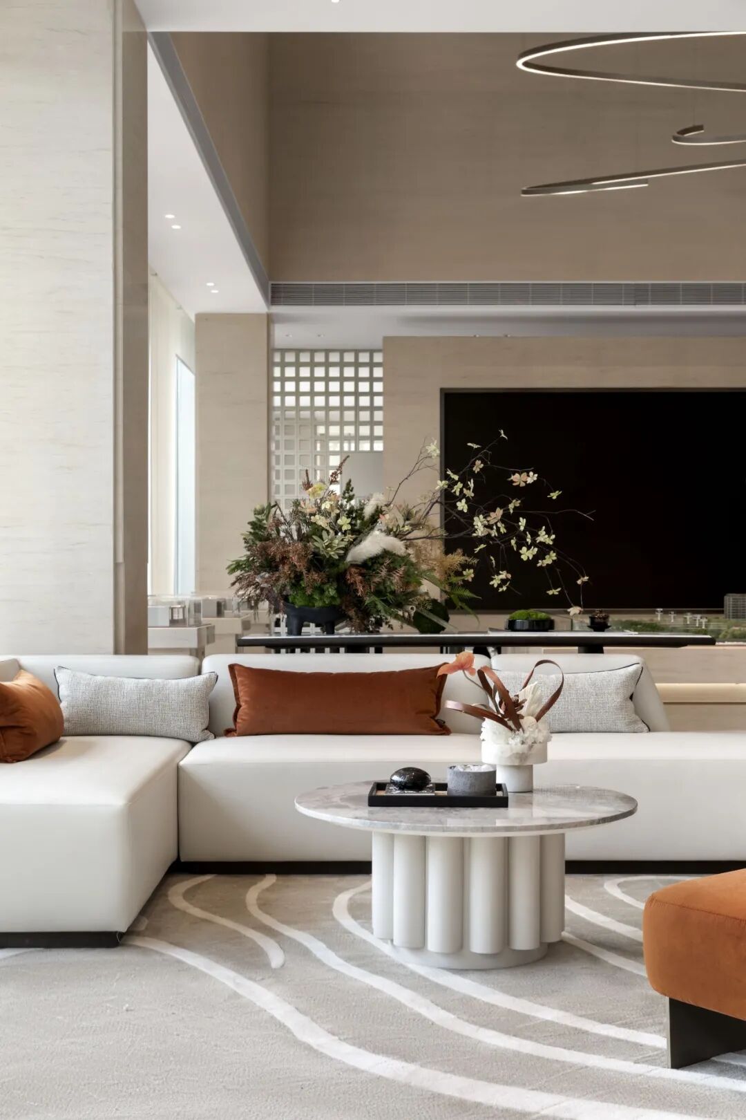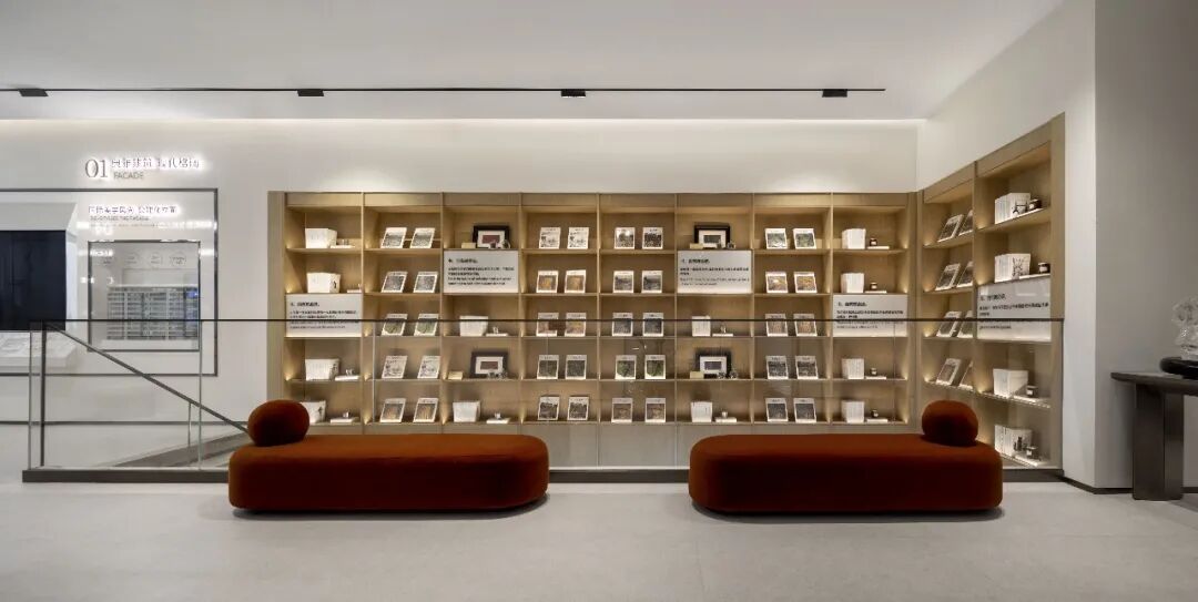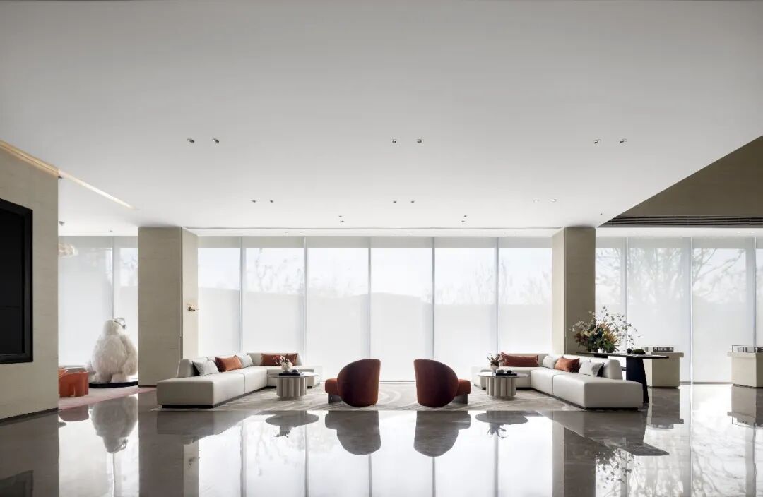 洽谈区整体以浅色为主,与建筑和墙面做统一及延伸,点缀橘色作为跳色,增加空间的色彩丰富度和视觉中心。
