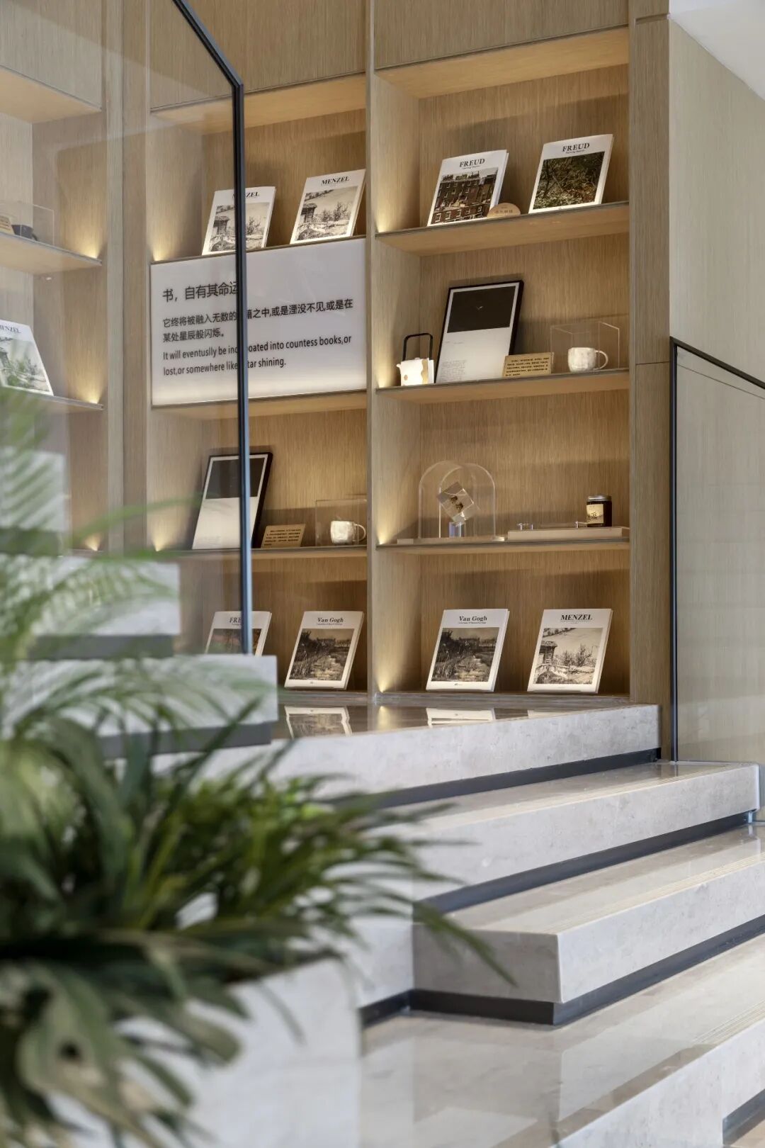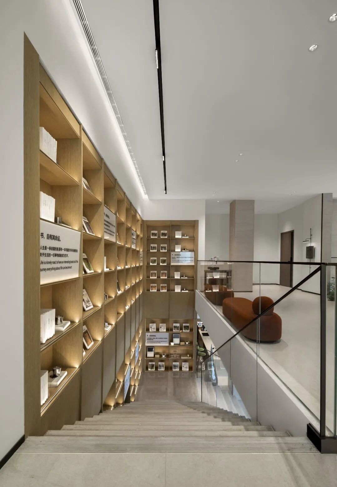 楼梯处将艺术书吧的元素融入进来,将楼梯单一的元素丰富,同时合理的规划了该处空间。