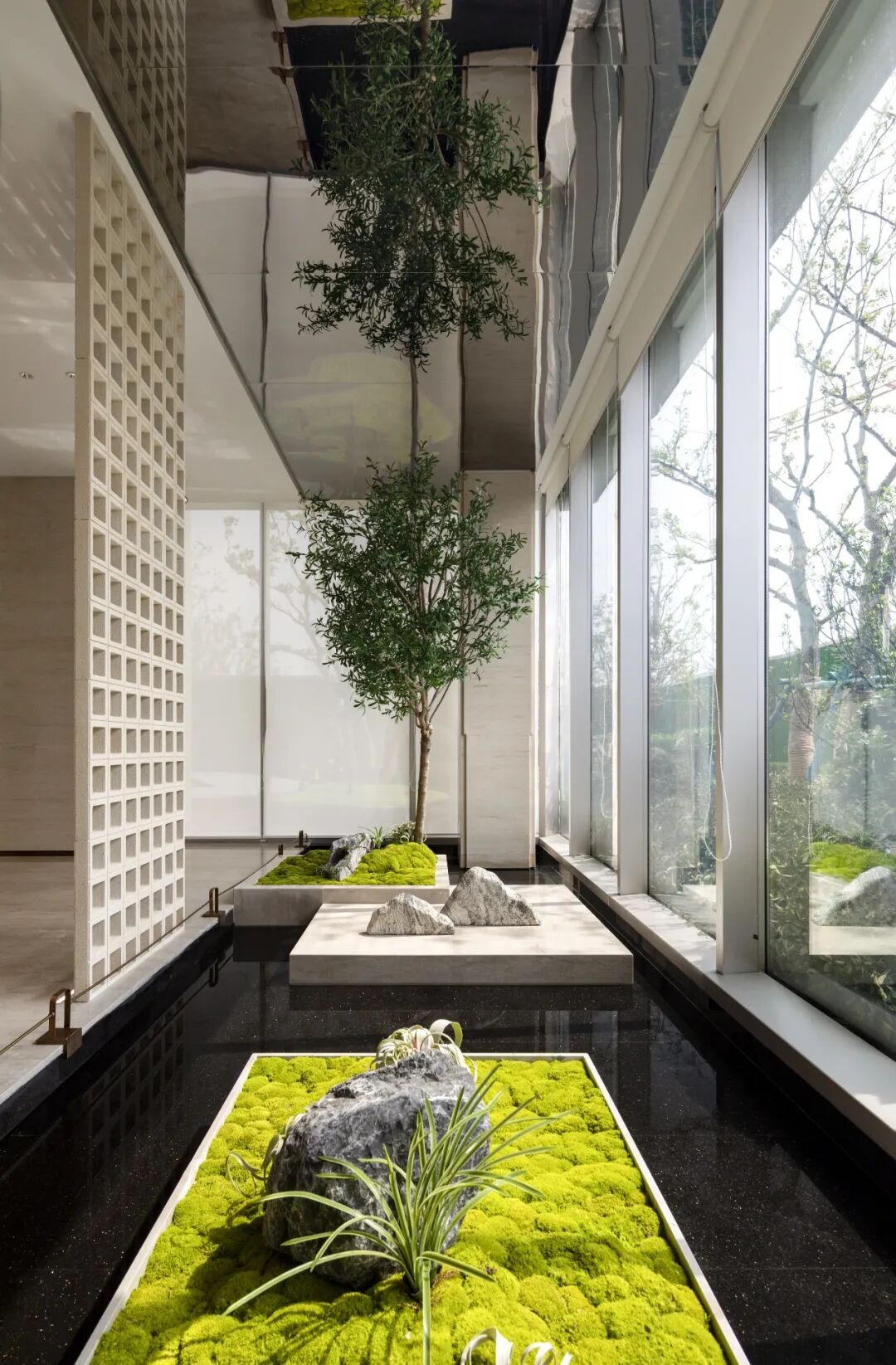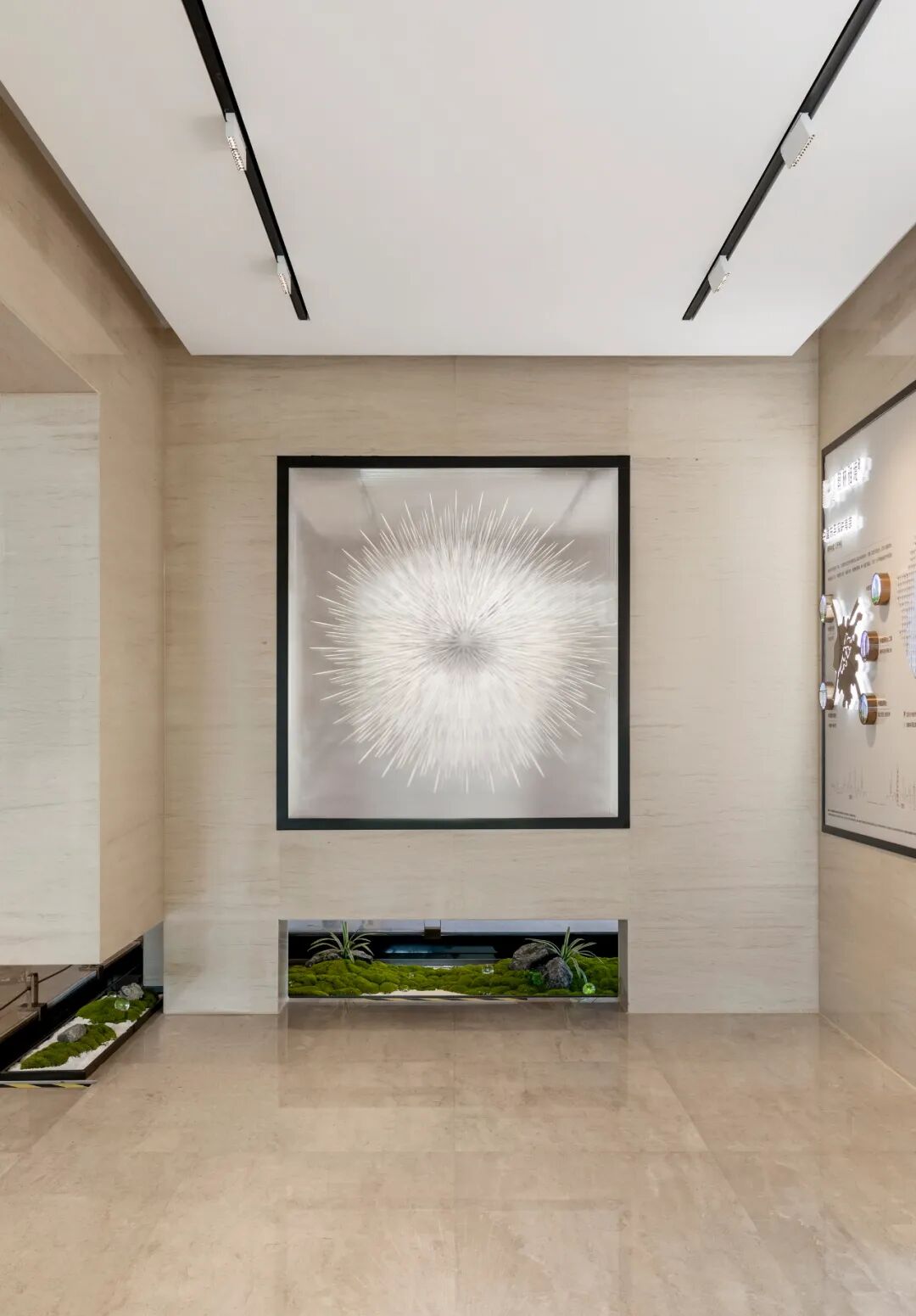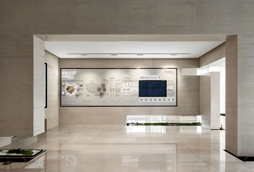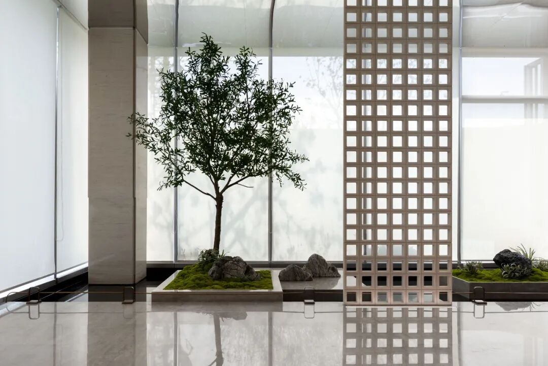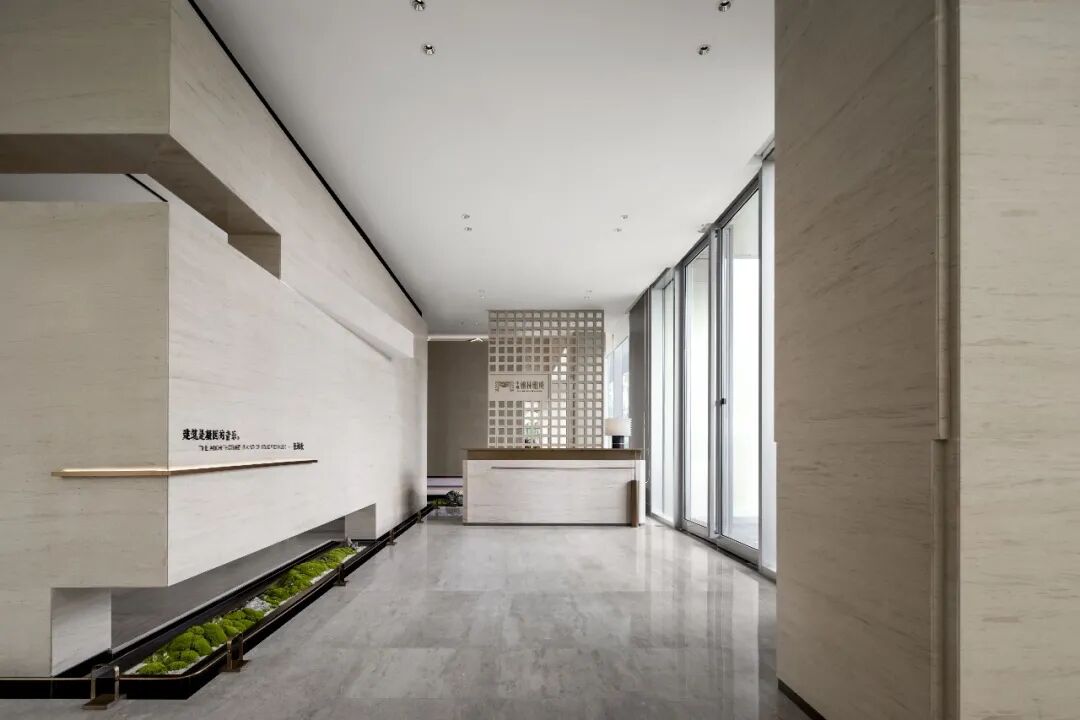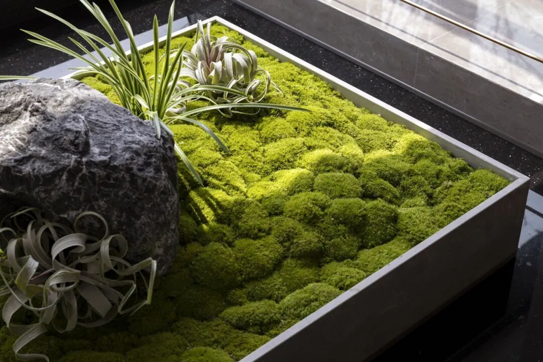 在走廊位置运用了绿植和苔藓的元素,将景观设计语言进行延续,接待台的材质与空间墙面呼应,让接待台融到空间去,使整个空间浑然一体。