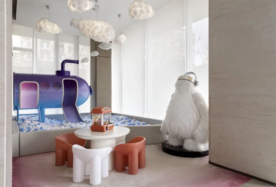 儿童区为天空主题,滑梯的造型选择飞艇造型,从烟筒中喷出云朵,宛如云朵制造器,在滑梯外侧增加海洋球池,增加儿童空间的娱乐性,让项目中的儿童可以沉浸式玩耍。