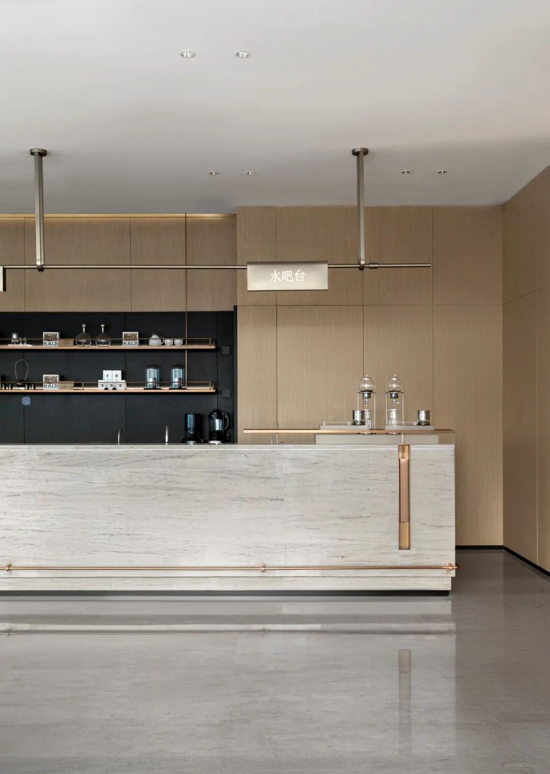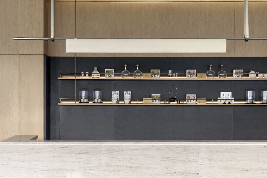 水吧区加入了茶文化的元素,陈列了茶具茶杯,以及设计款茶盒的元素。贴合项目主题以及项目在地的本土文化氛围。在灯光的映衬下让陈设物品的质感更加出彩。