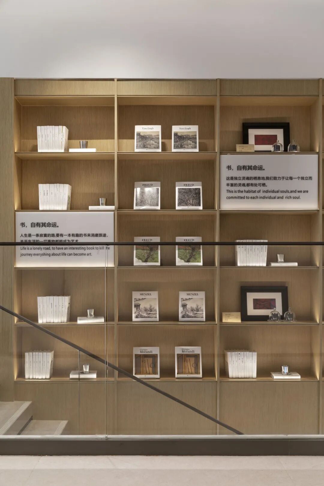 在配饰上也避免了单纯的书籍陈列,加入许多有趣的摆件组合以及香薰的文创介绍,将书吧的氛围丰富起来。