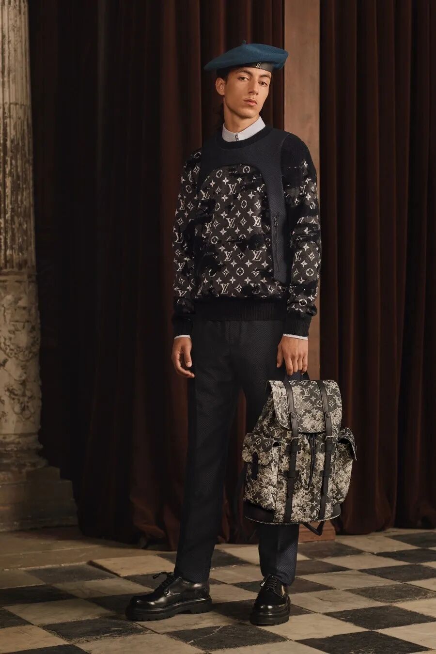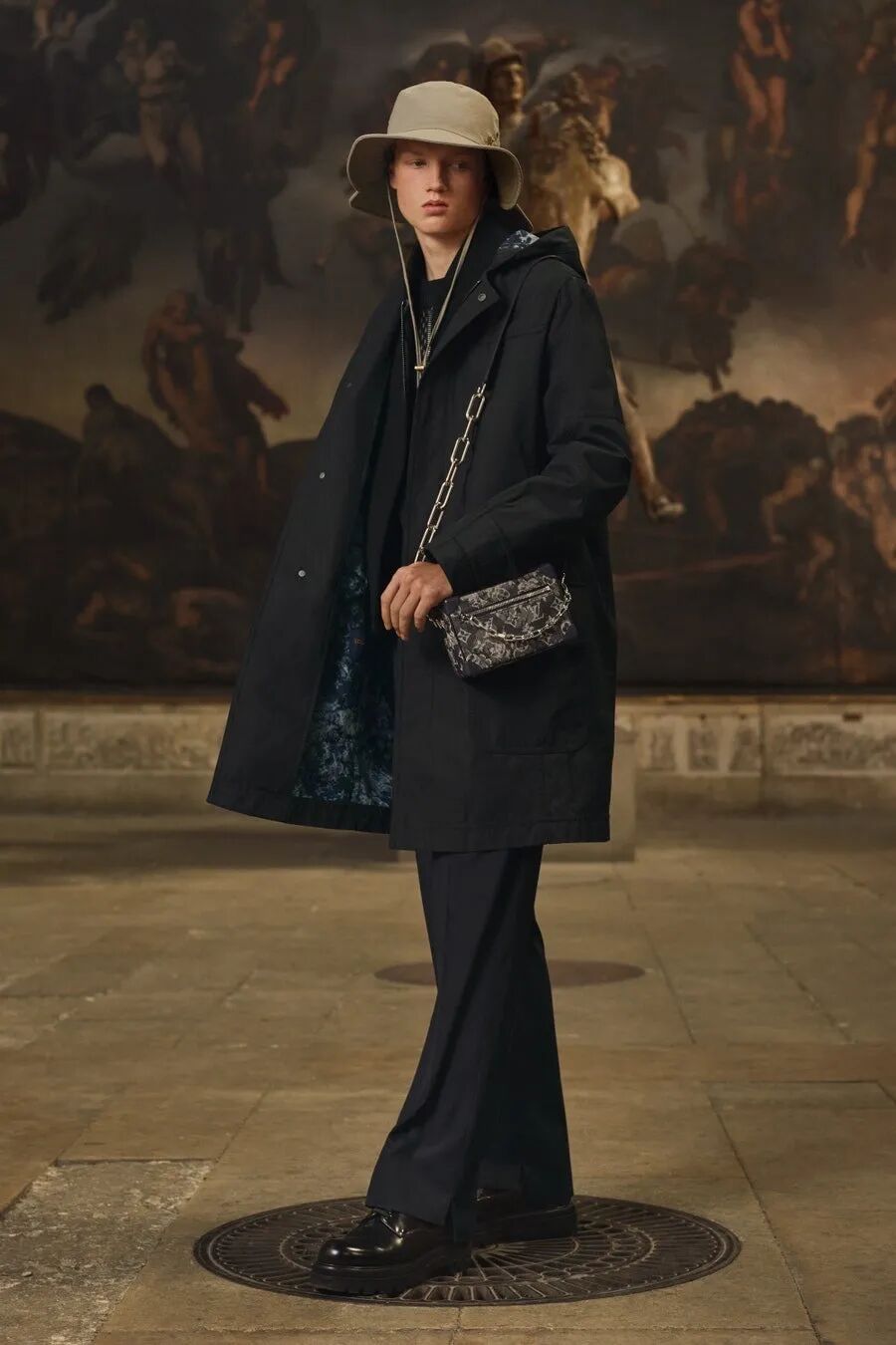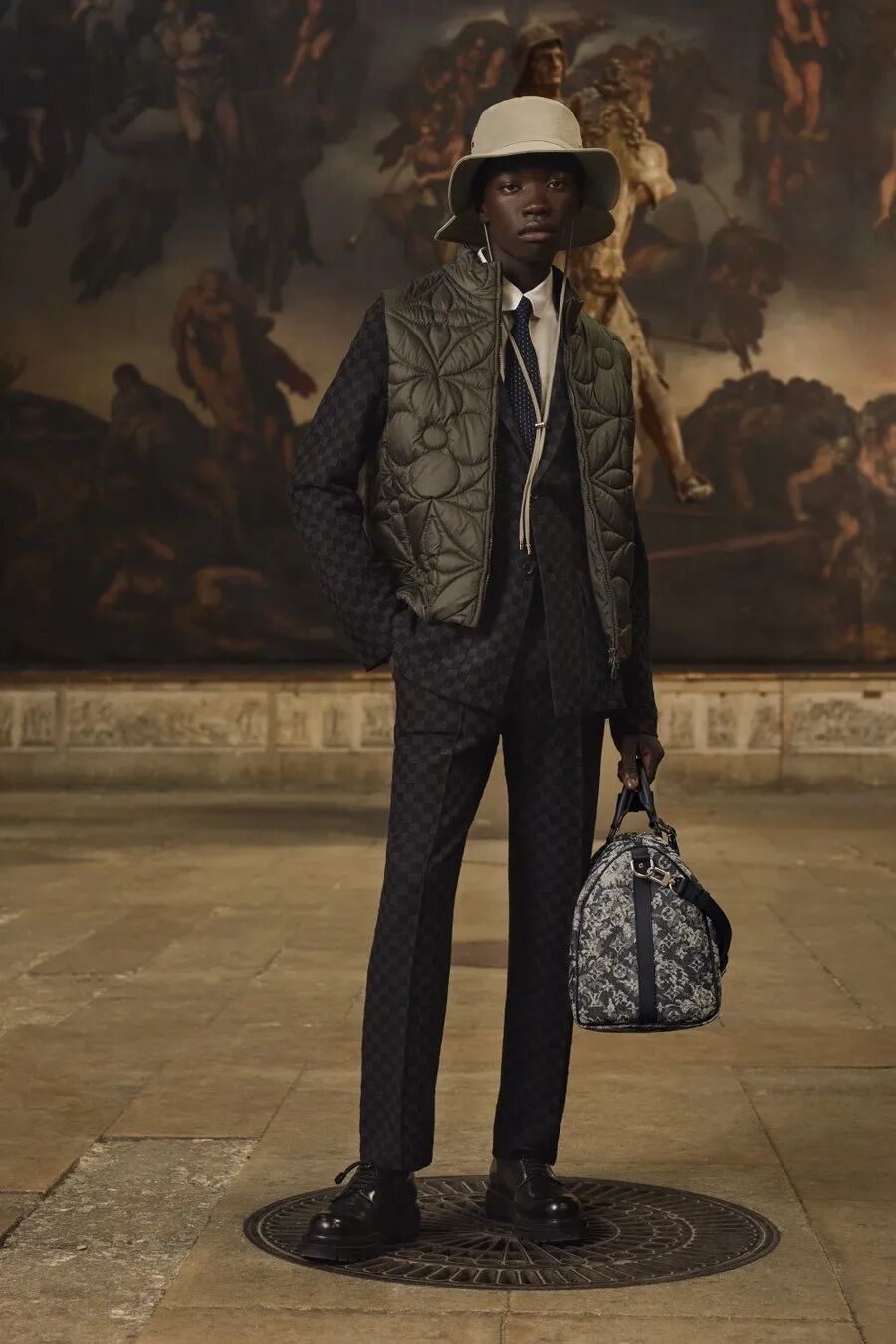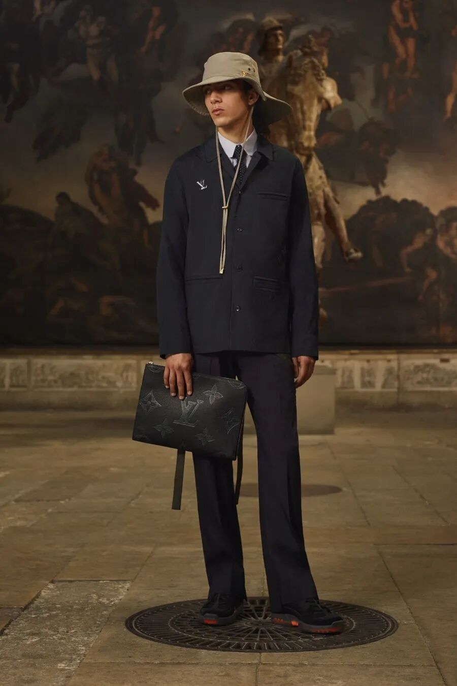 此次LV的Look像是在油画中伫立的男子,精致剪裁的西装,利落帅气的皮衣,机能感十足的风衣夹克、经典的Monogram图案贯穿整个系列,Virgil Abloh竭力的向人们展示Louis Vuitton的历史、工艺与交际能力。