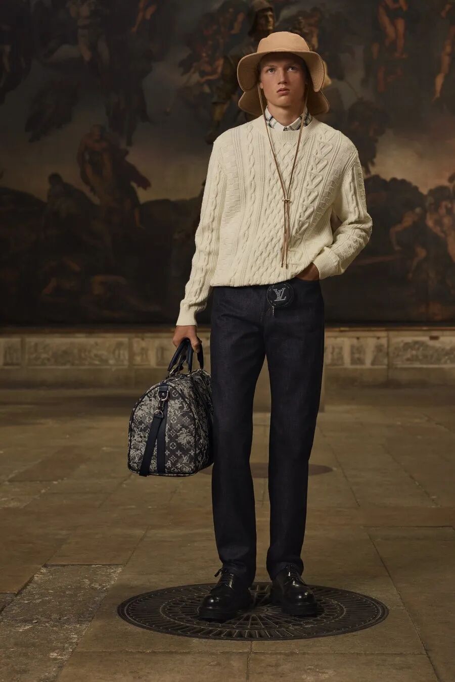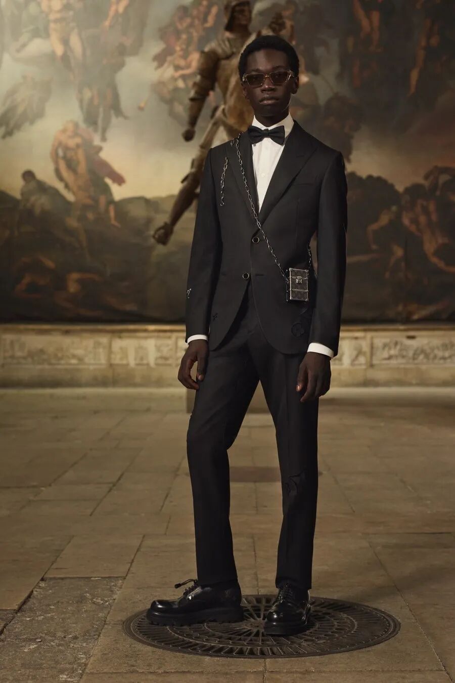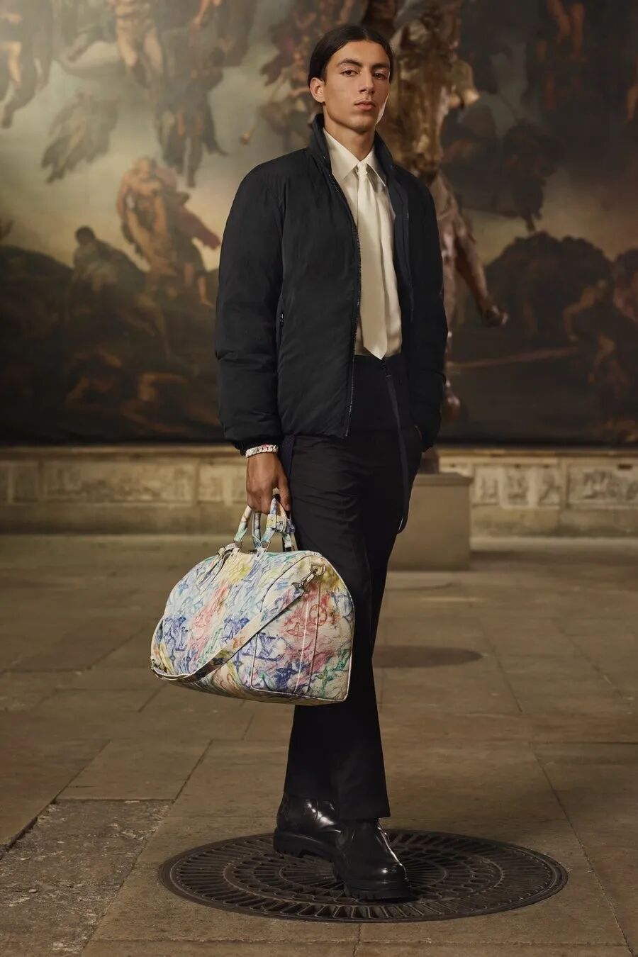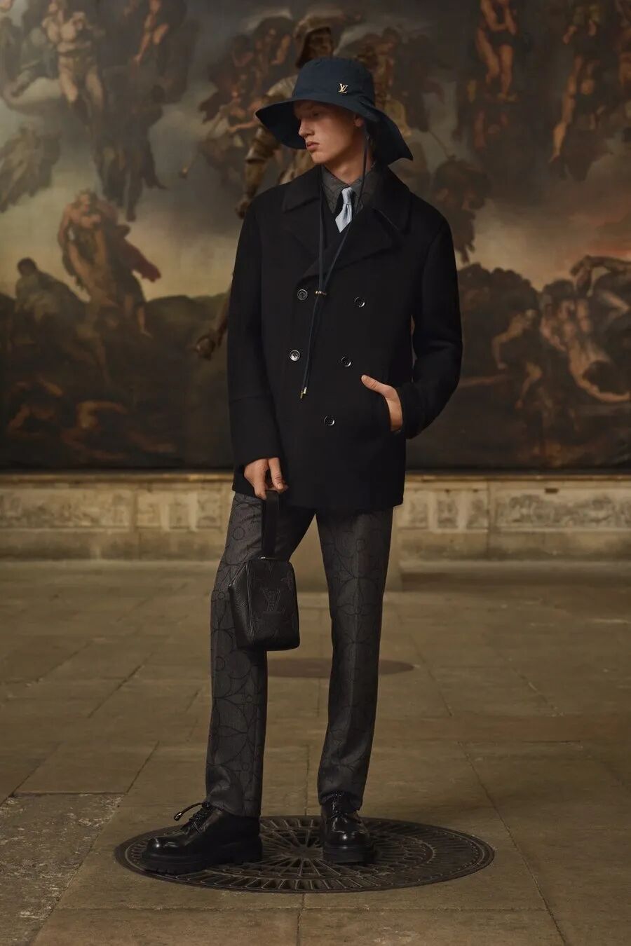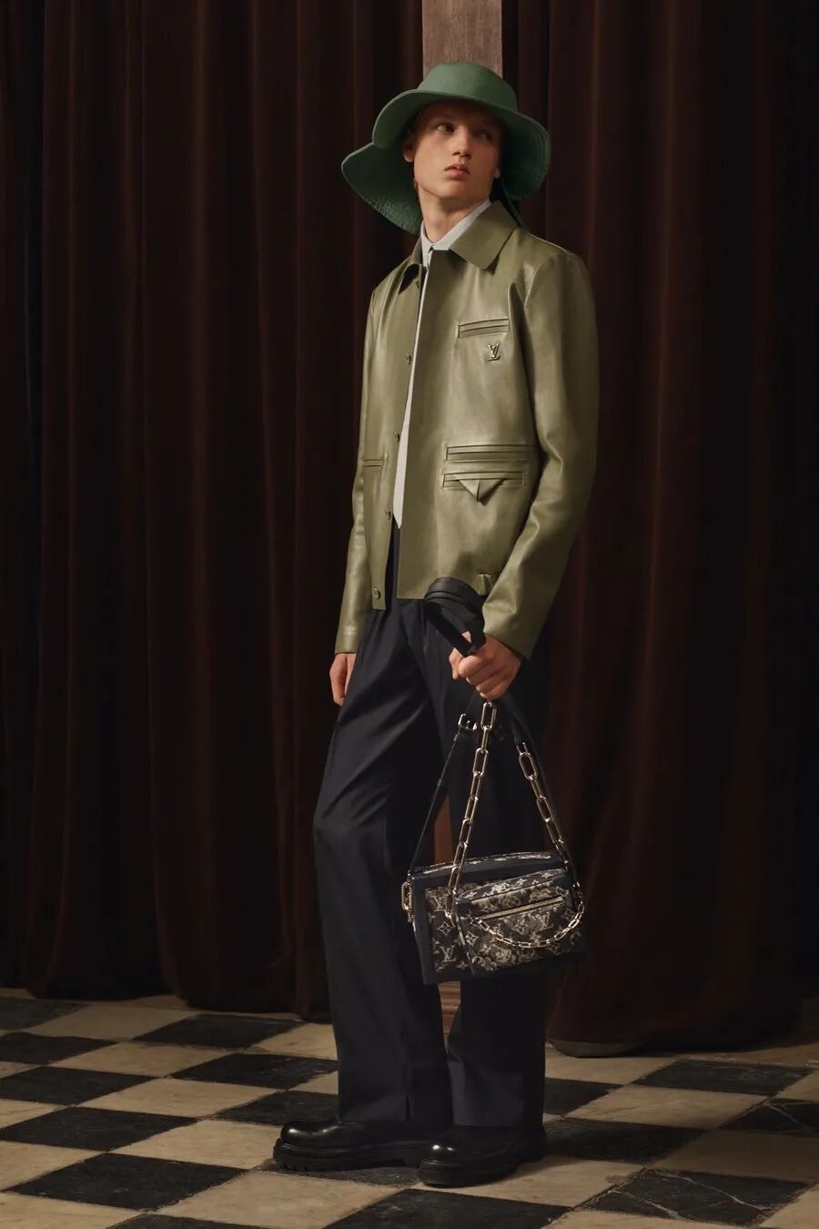 此次LV的Look像是在油画中伫立的男子,精致剪裁的西装,利落帅气的皮衣,机能感十足的风衣夹克、经典的Monogram图案贯穿整个系列,Virgil Abloh竭力的向人们展示Louis Vuitton的历史、工艺与交际能力。