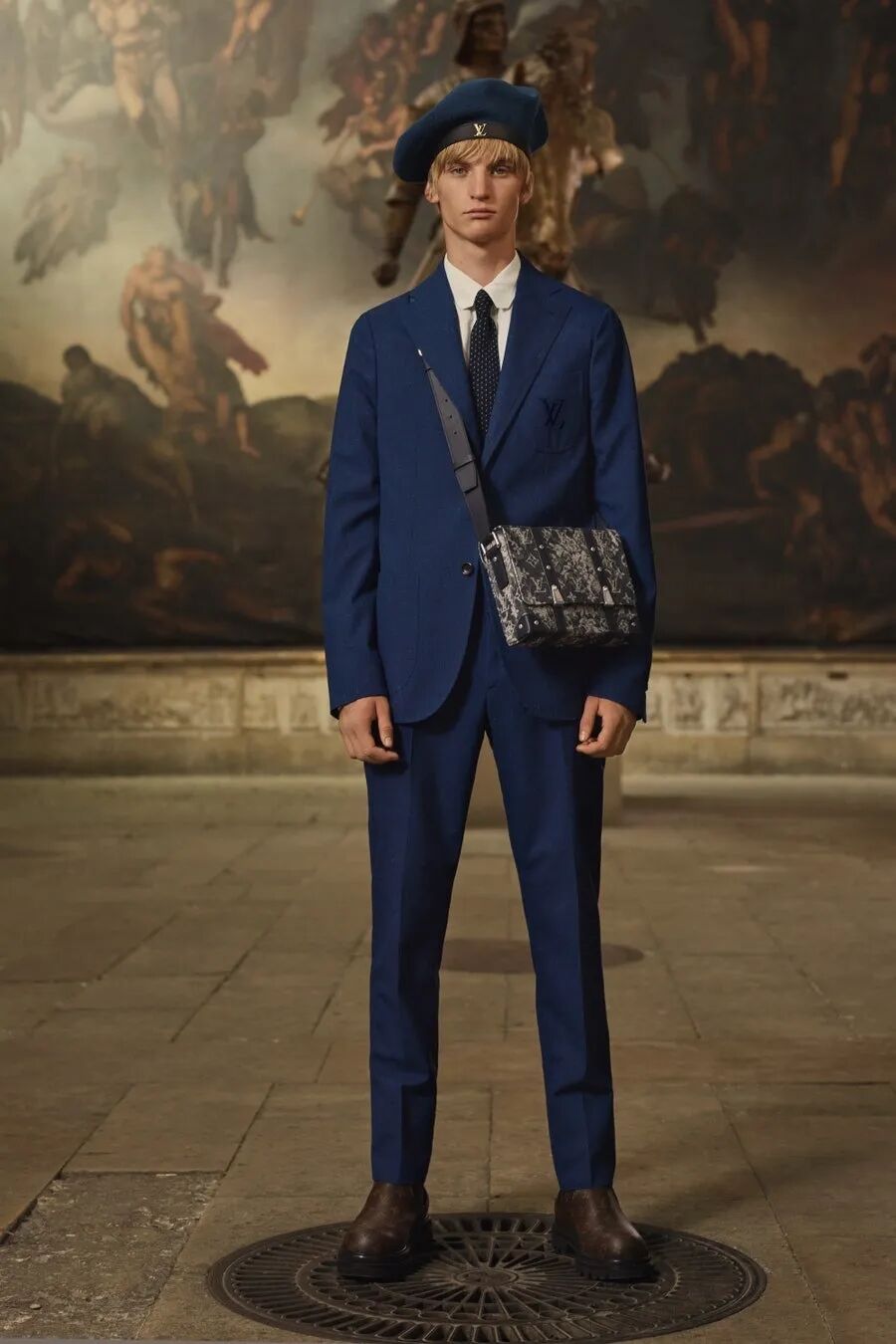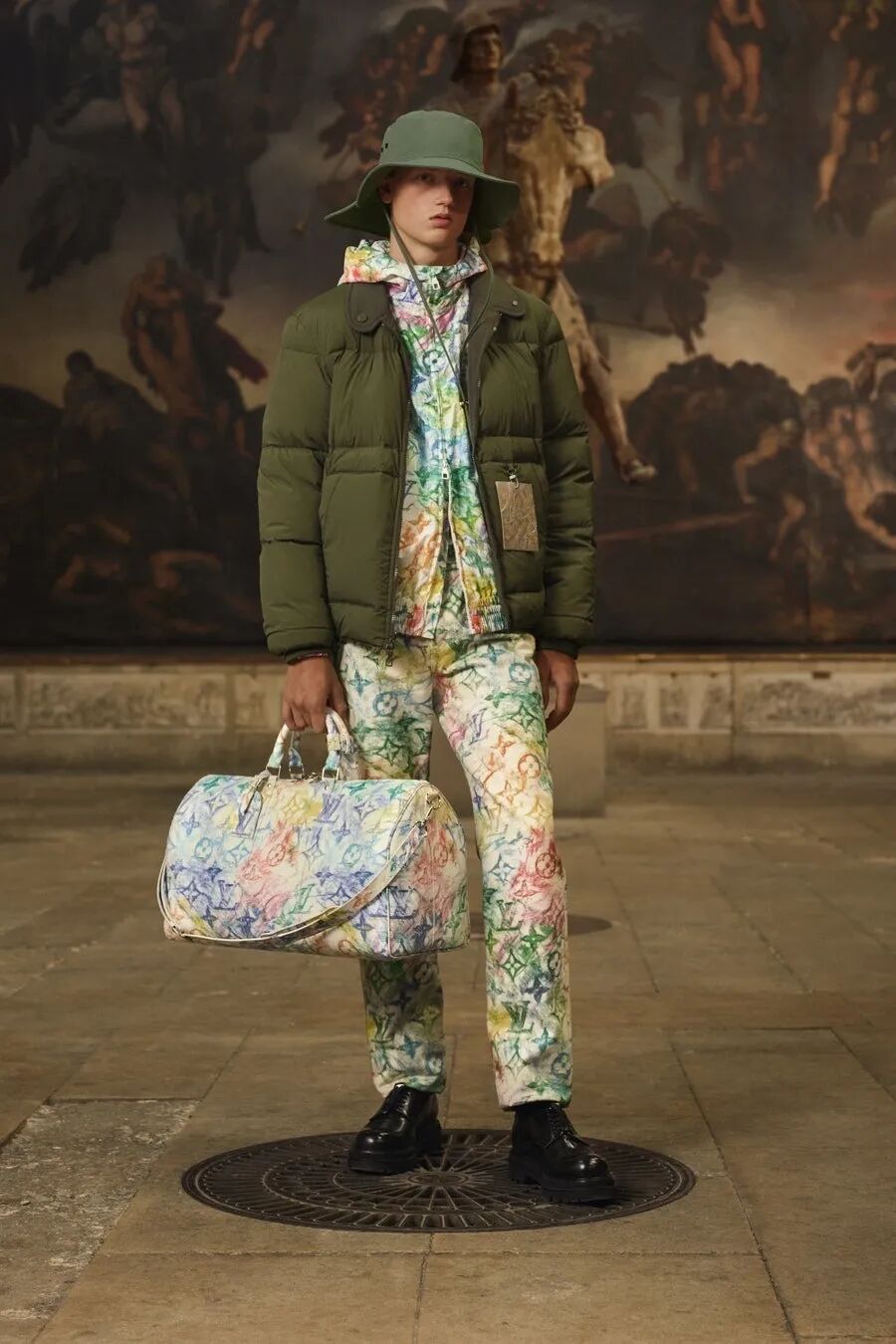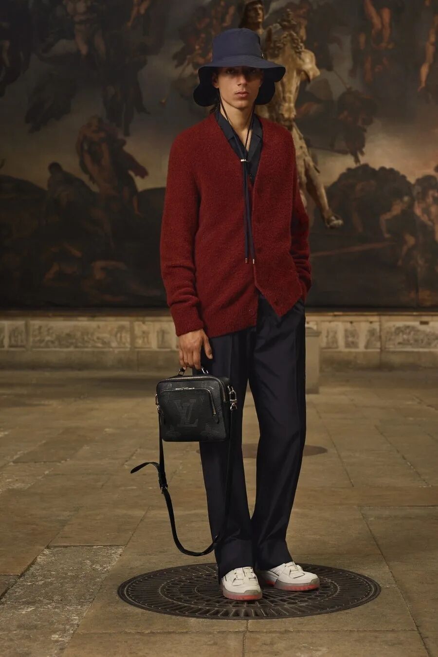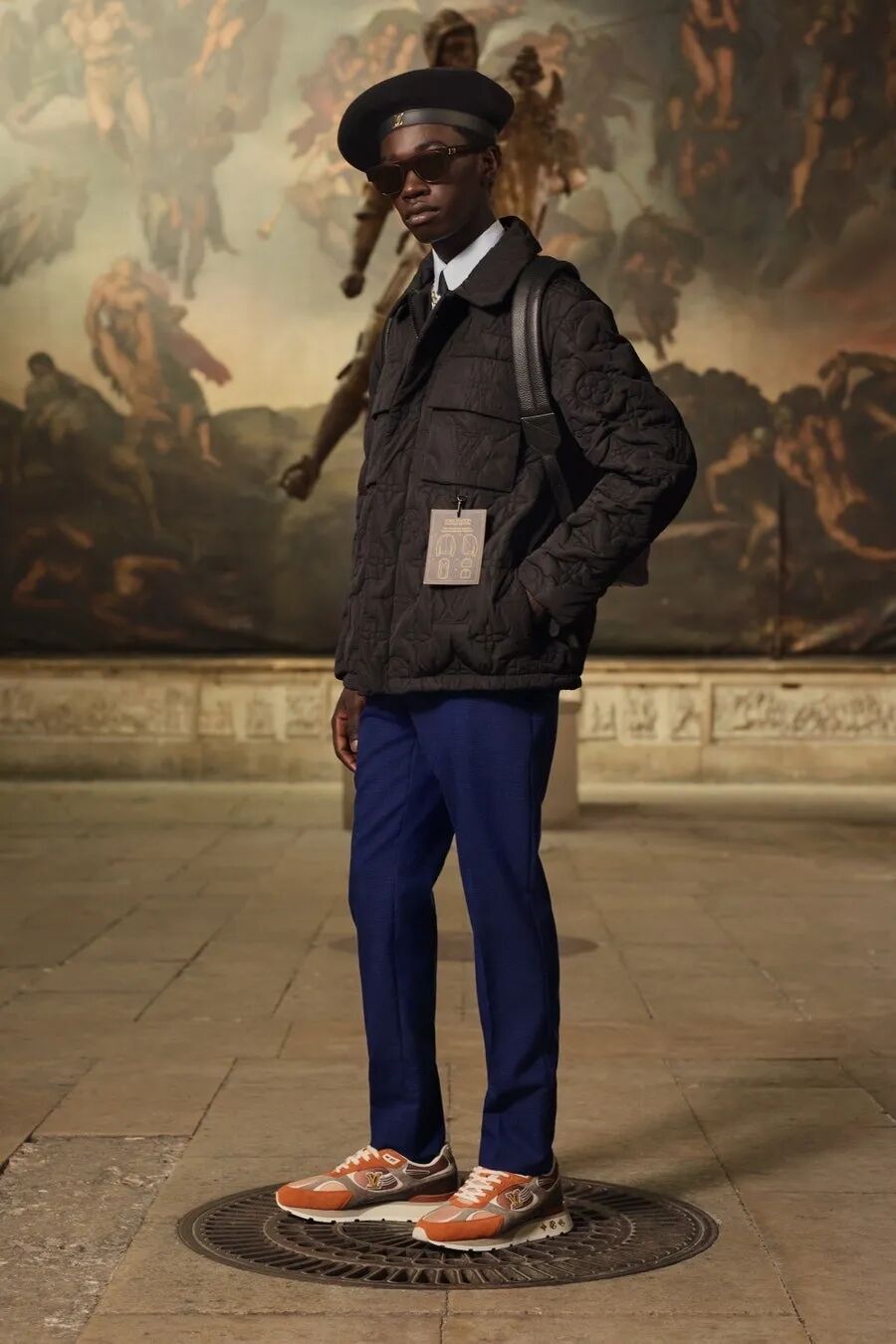 此次LV的Look像是在油画中伫立的男子,精致剪裁的西装,利落帅气的皮衣,机能感十足的风衣夹克、经典的Monogram图案贯穿整个系列,Virgil Abloh竭力的向人们展示Louis Vuitton的历史、工艺与交际能力。