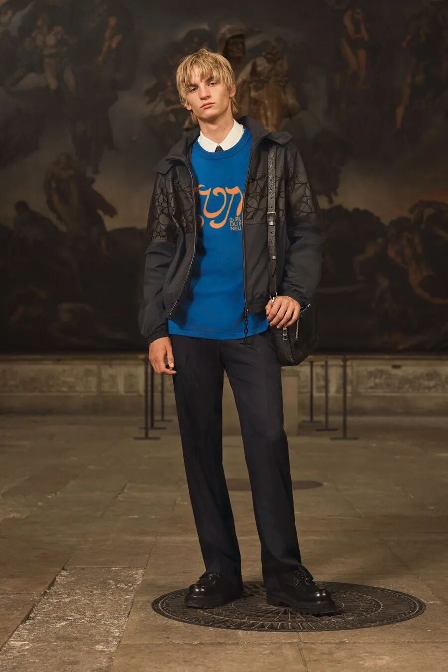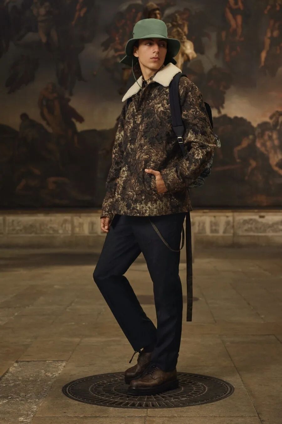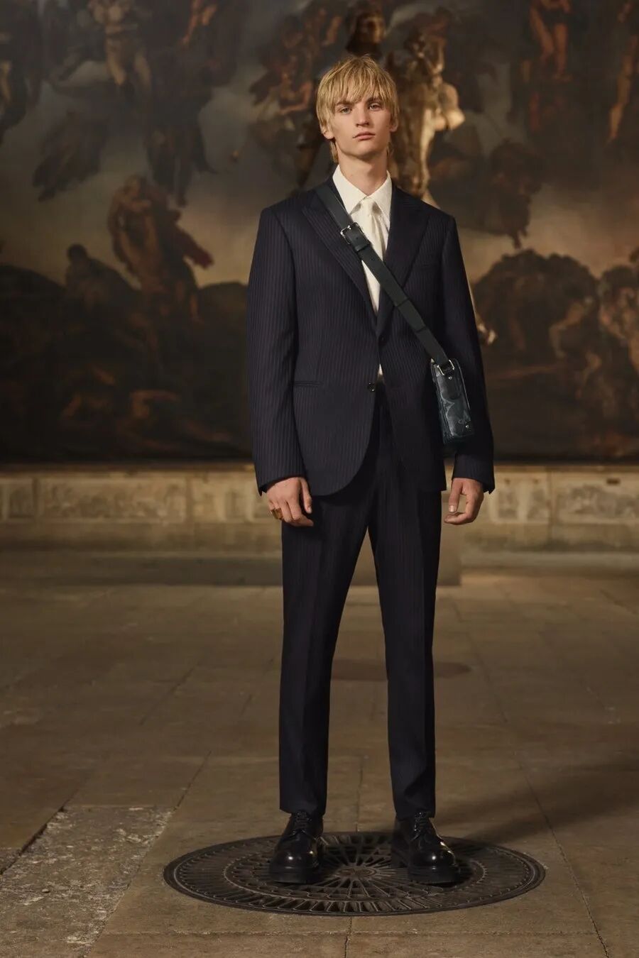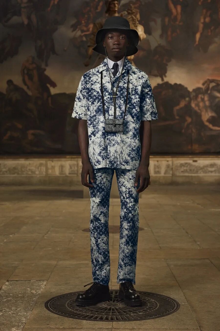 此次LV的Look像是在油画中伫立的男子,精致剪裁的西装,利落帅气的皮衣,机能感十足的风衣夹克、经典的Monogram图案贯穿整个系列,Virgil Abloh竭力的向人们展示Louis Vuitton的历史、工艺与交际能力。