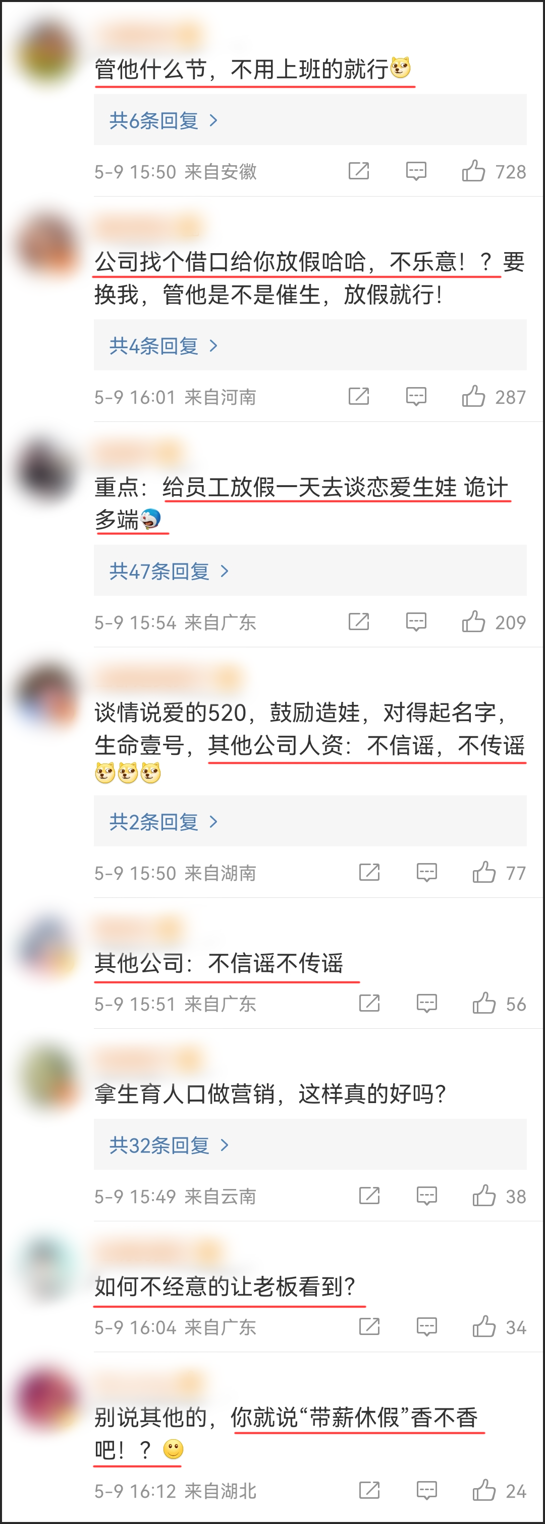 最新文章2023-04-07 卷起来了?公司放520带薪假也太宠了! 你见过公司给员工放520带薪假期的吗? 5月20日”是网友们自发兴起的节日——网络情人节,借助数字密码,含蓄地表达爱情。 换句话来说,520节日跟假期压根就是八竿子打不着,放带薪假很多人可能做梦都没想过。 但就是这个“白日做梦”的想法,竟然真有公司实行了,下面是这家公司发布的《关于2022年520放假的通知》文件: 根据现在年轻人的生育意愿,300年后我国人口将不到1亿人。我司要做百年企业,届时只能请印度、越南、非洲等外籍人士。 文件中还写到,你不婚,家族香火谁来接。我不生,民族复兴谁来撑。在520到来之际,公司研究决定,5月20日后台员工带薪休假一天,谈谈情,说说爱,造造娃。 这则通告已被证实,属实让人羡慕啊,网友:“管他什么节,不用上班就行” 天地壹号董事长回应称:“我的员工我来宠” 试问这样的企业怎能让人不爱? 接下来让人万万没想到,520放假公司之间也开始内卷了。 司沃康SVAKOM正式将520定为公司节假日,将用每个520去宠爱每位员工。 下面是公司内部的正式通知: 别说员工了,就只是看看我都有种被宠的感觉! 还有一家公司更有意思,允许提前1小时下班,当天套套管够,并且还在公司组织相亲活动,帮助员工脱单。 虽然520当天没有放假一天,但从发言来看,杭州这家公司也一定很宠自己的员工,真的太有爱了。 一个小举动就足以温暖人心。。 若宠爱员工成为公司之间的新内卷,我相信职场环境一定会好起来,而且卖力工作的人也会更多。 最后,今年520你公司有什么特殊福利吗?你又准备怎么过? 推荐阅读 动手标星,精彩文章不错过 本文来自微信公众号“美工美邦”(ID:laozhang-sj)。大作社经授权转载,该文观点仅代表作者本人,大作社平台仅提供信息存储空间服务。 TAGS: 公司员工放假爱网友 相关文章英赫日报 | 李宁 × 空…米兰时装周的异星来客,用结…米兰“MoLo”移动与物流…西班牙艺术家 Juan d…把小鸟画成美少女,她弃医从…这些鸡蛋包装不只是有趣,设…国产文具又炸了!晨光再造“…七点资讯 |《更衣人偶坠入…AlphaDraw筑绘通「…秦始皇的黑,是你不懂的黑。