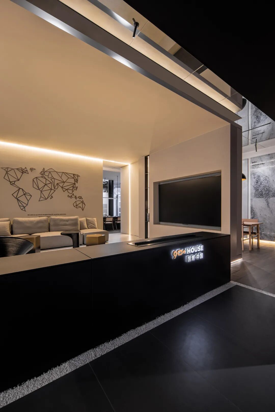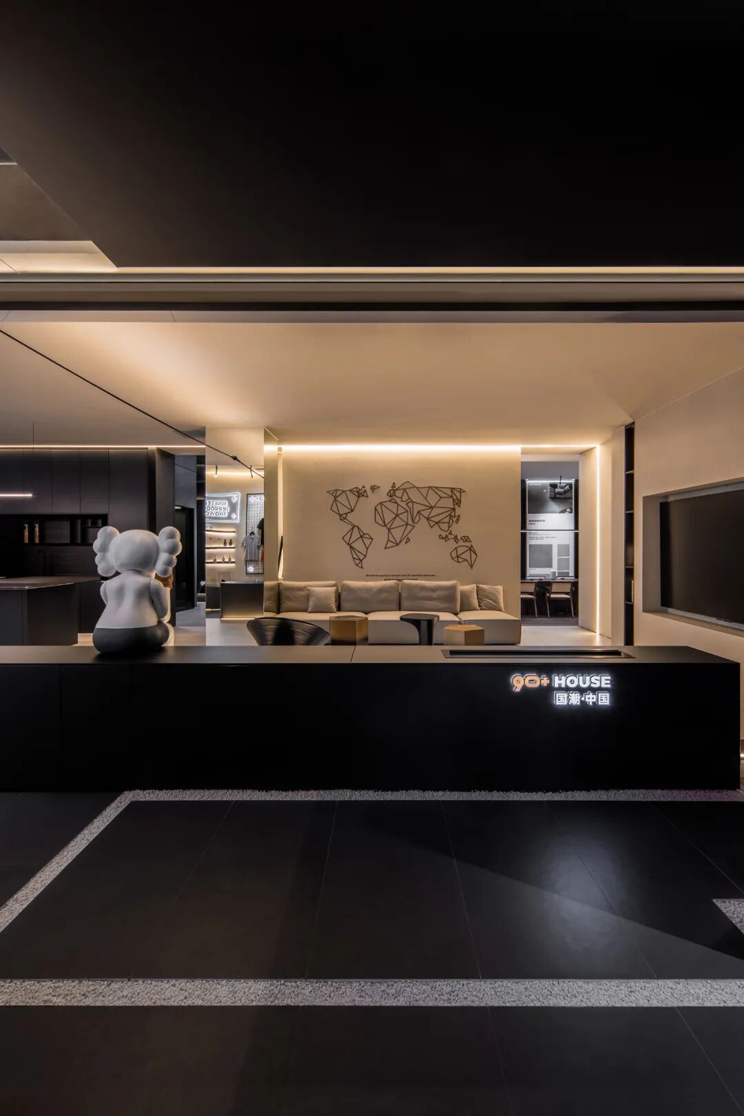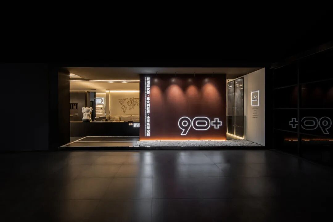 设计师用朴素的、简单的、纯真的纵横线条构成独特美学比例的二维与三维几何造型,为90+ HOUSE空间发声,形成品牌空间视觉节凑。