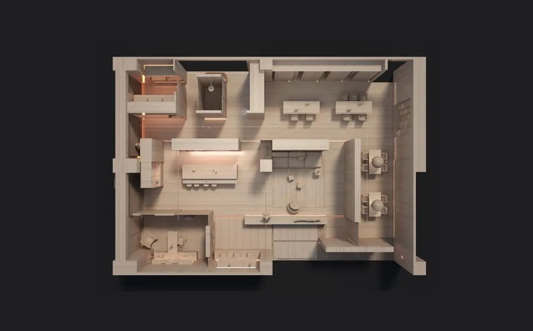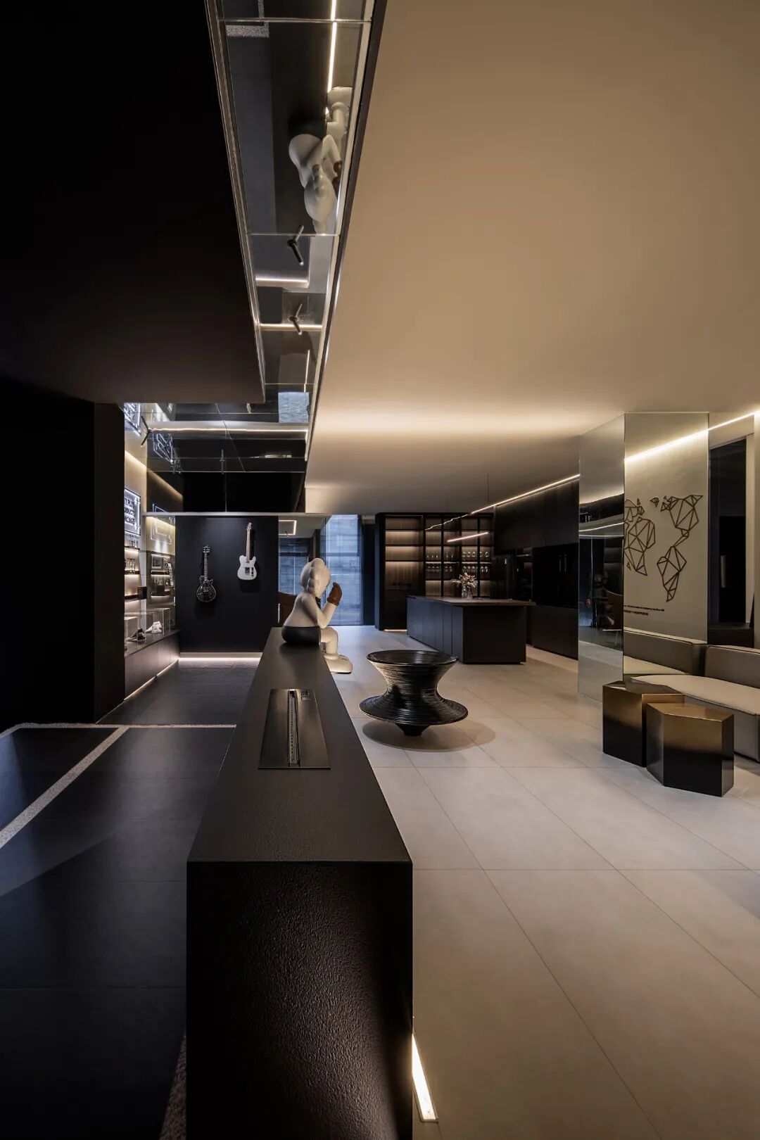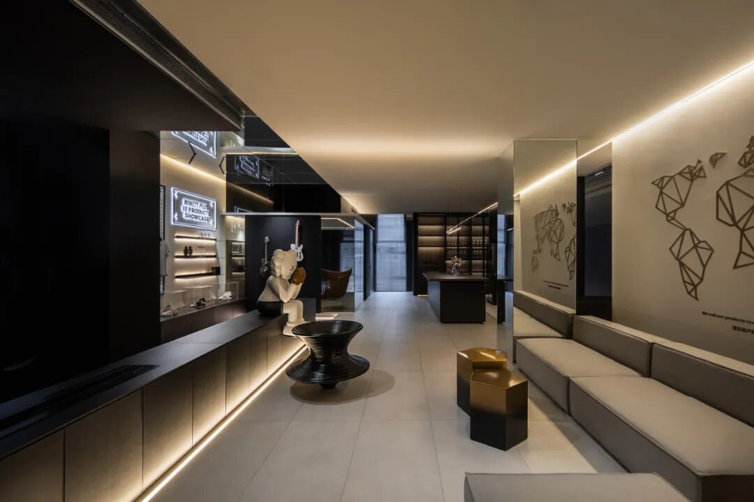 不同的事件在不同尺度和不同开放程度的空间发生。设计师在思考与行为方式时,同时反思战略意识,审视空间存在性与复合性。塑造流通感极强的空间,盒子造型与其外部空间顶面镜子处理,增强了空间纵向的张力;盒子造型既把空间分割又把空间距离似乎拉得更近,营造不同的场域感。
