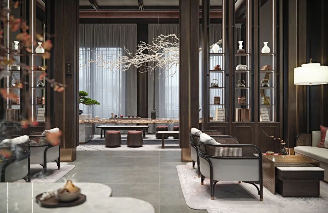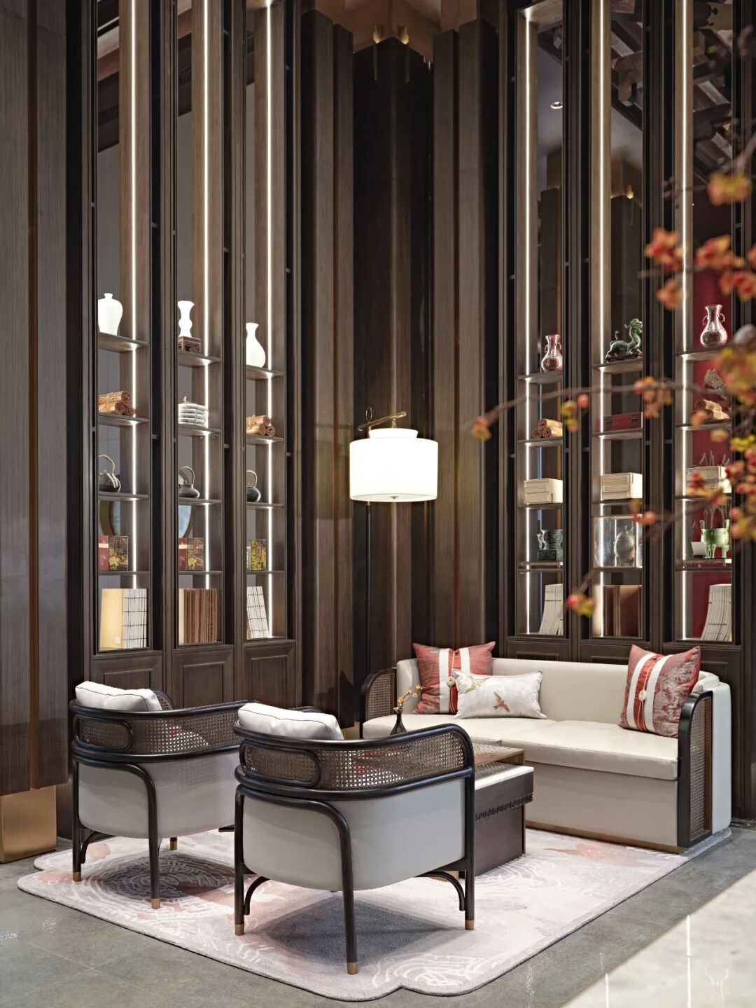 过厅设计师以松鹤造景,通过富有秩序的虚体界面隔断,保证了景观的连续性又依次有所变化。步入长廊之中,空间的不同景观层叠渗透、营造,增加了动态路线趣味性与丰富体验。