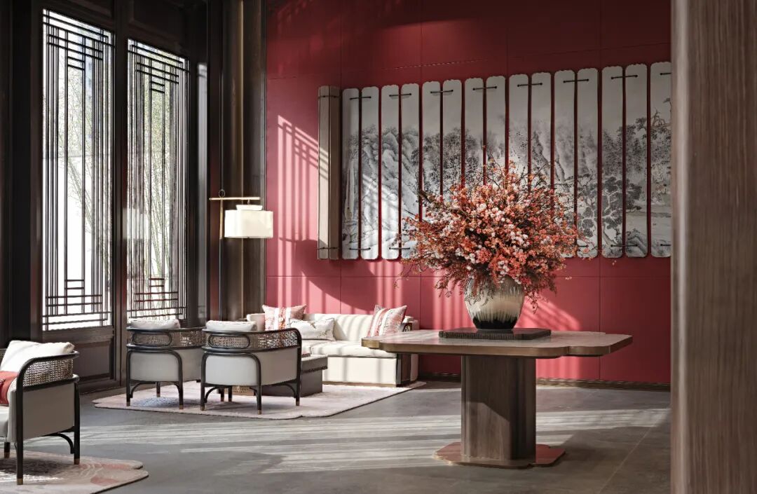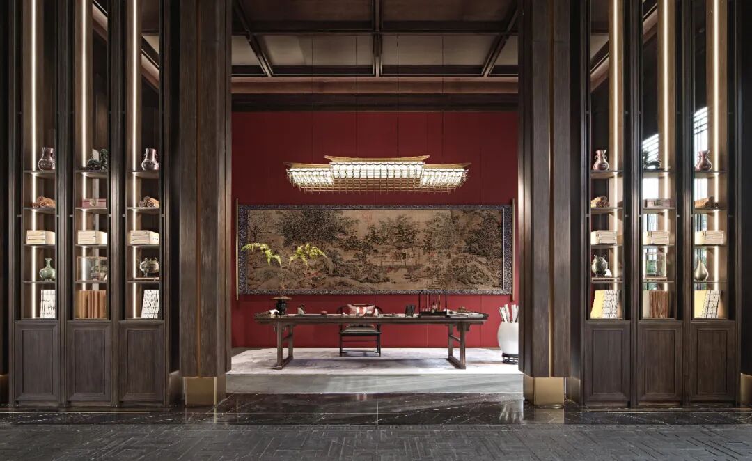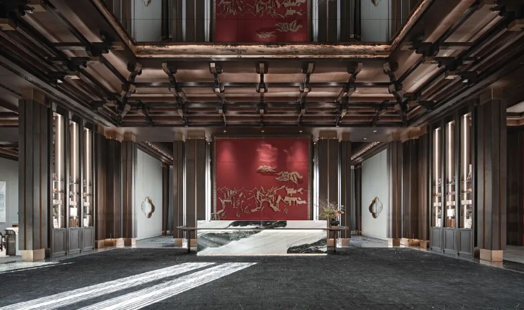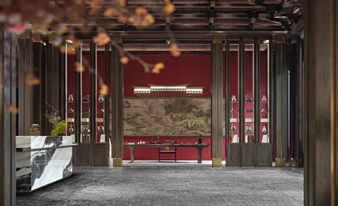 步入接待前厅,黑白大理石台面平添了几分水墨写意,不锈钢装置由著名画家吴冠中《江南水乡图》中提淬取意而出,复古红墙与金属框架碰撞出雅致的“画境”:藉由空间笔触,寥寥数笔,远山丘壑,近处人居,动静间境与意相生、契合。