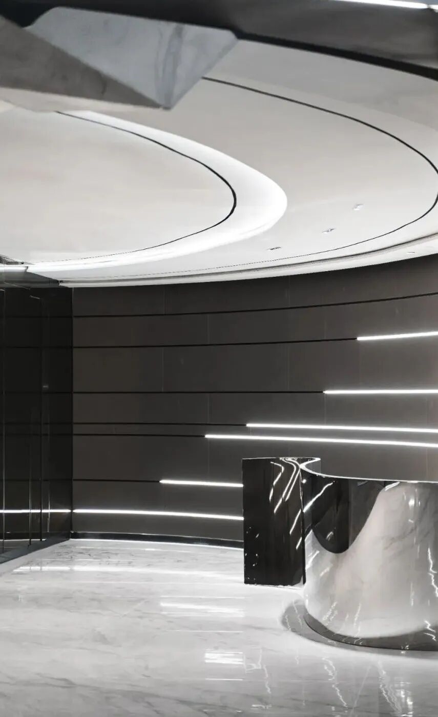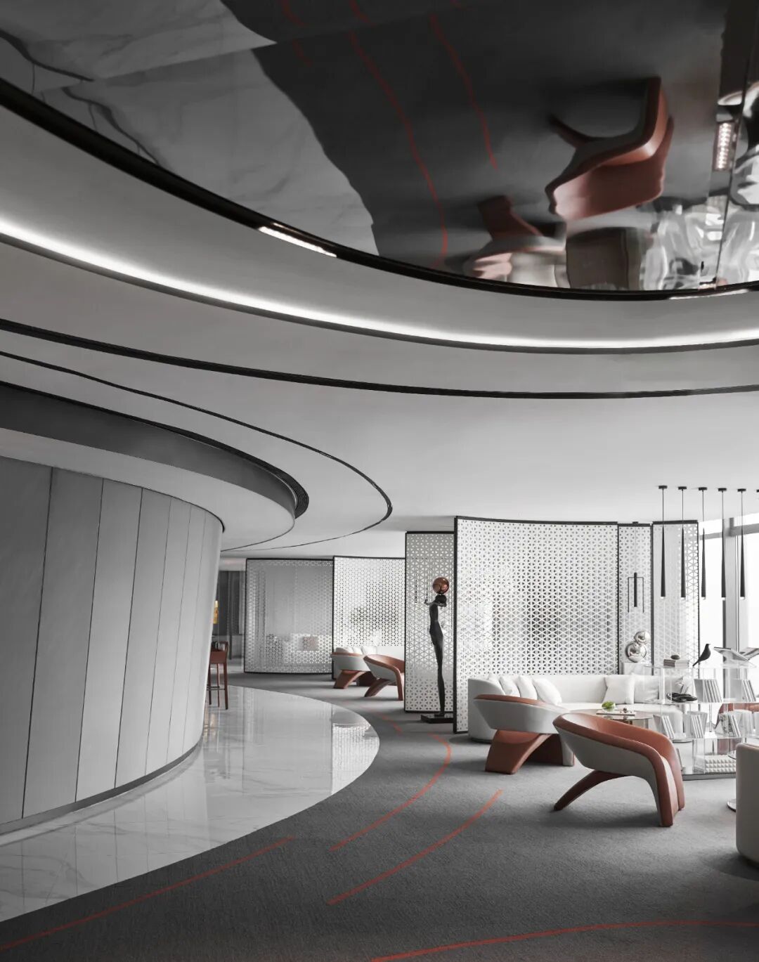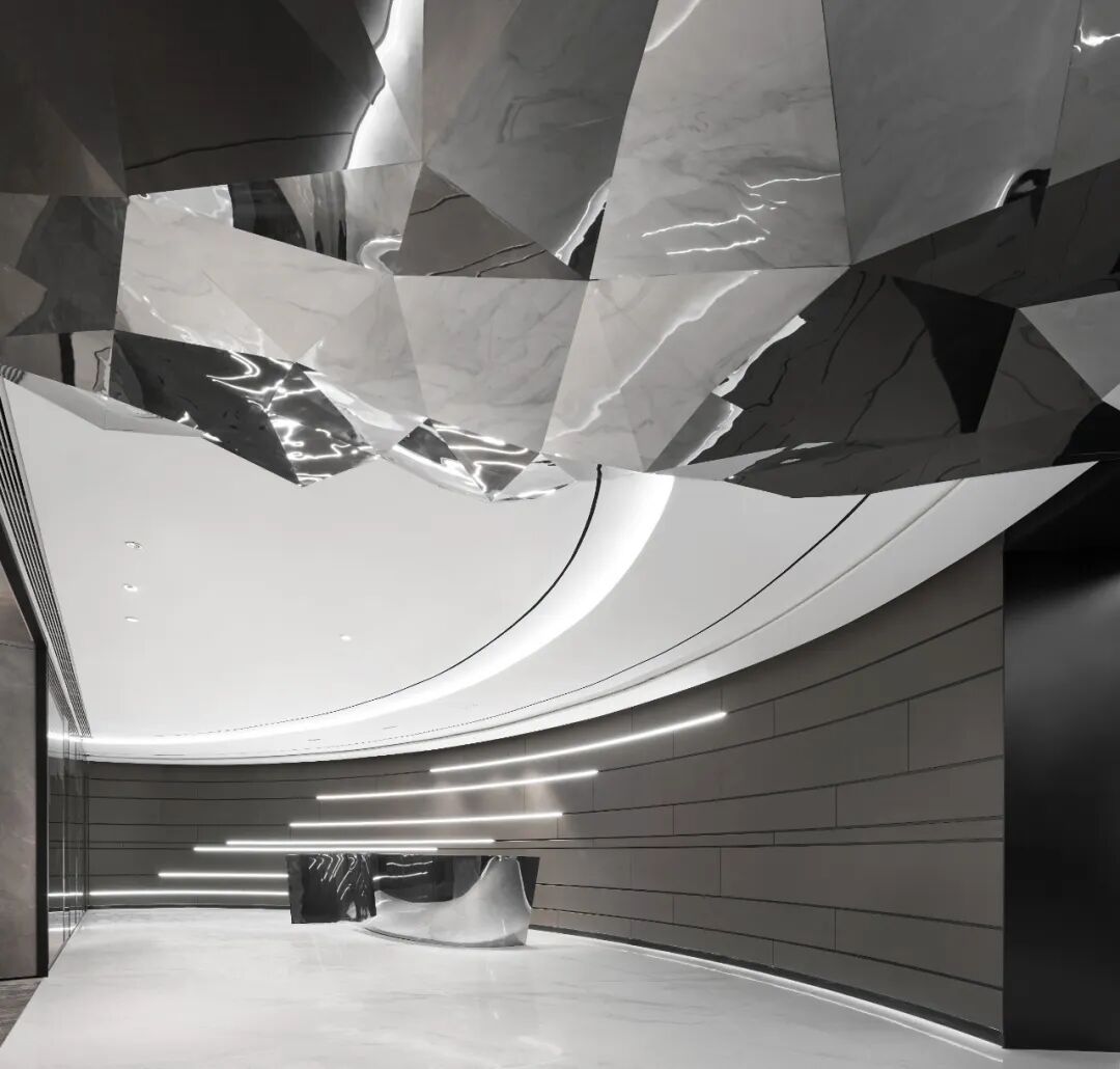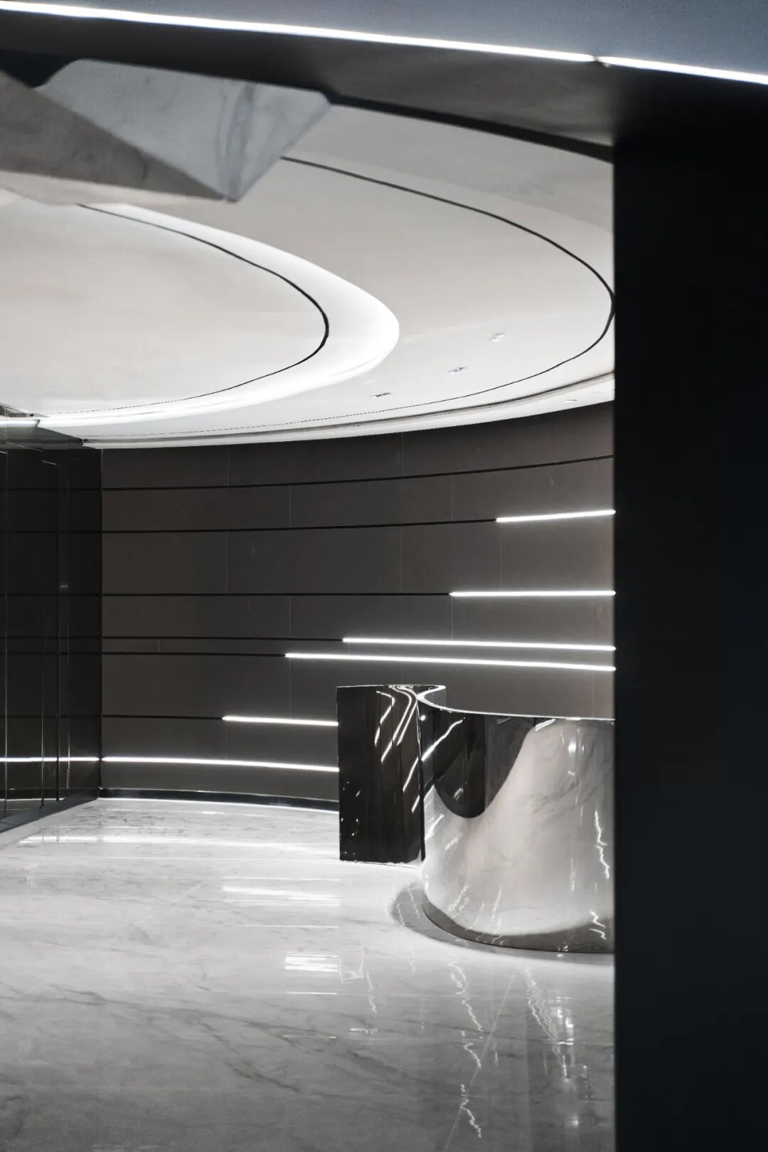 步入接待前厅,如飘逸纺布般的接待台映入眼帘。通过镜面材质创新诠释纺布形态,为空间增添了独特的艺术张力。而镜面接待台与墙面线性灯光相辅相成,让空间富有科幻律动感,由此展开一场云端漫步的探索之旅。