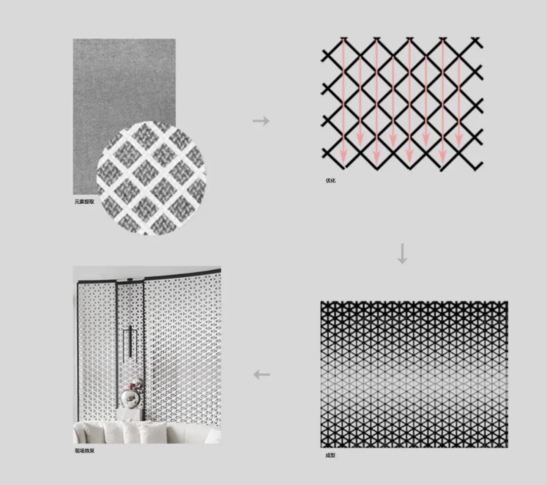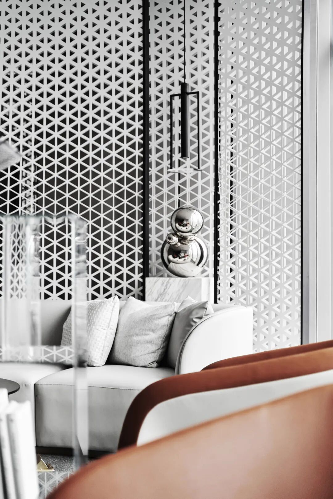 错落有致的编织屏风,是设计师对纺布元素的新颖演绎,更是严谨又温柔的情感表达,让简洁有力的现代美感渗透进空间的每个角落。
