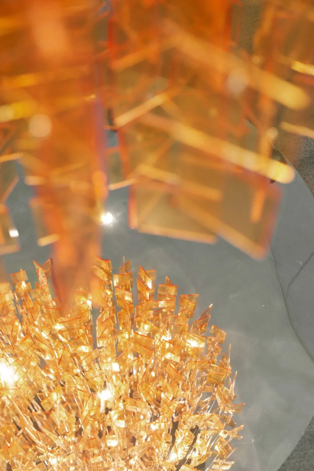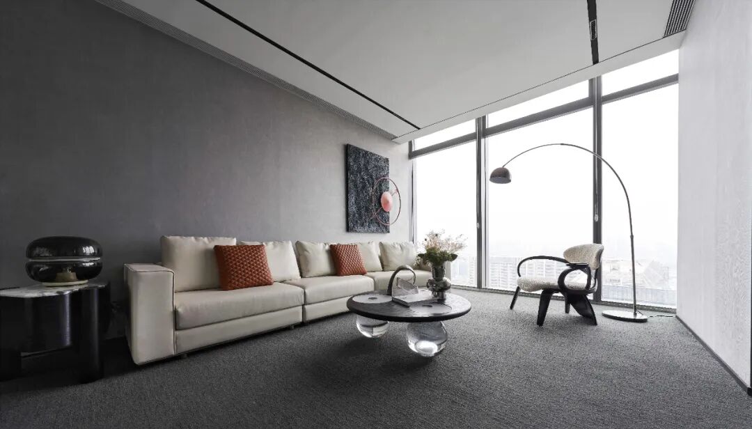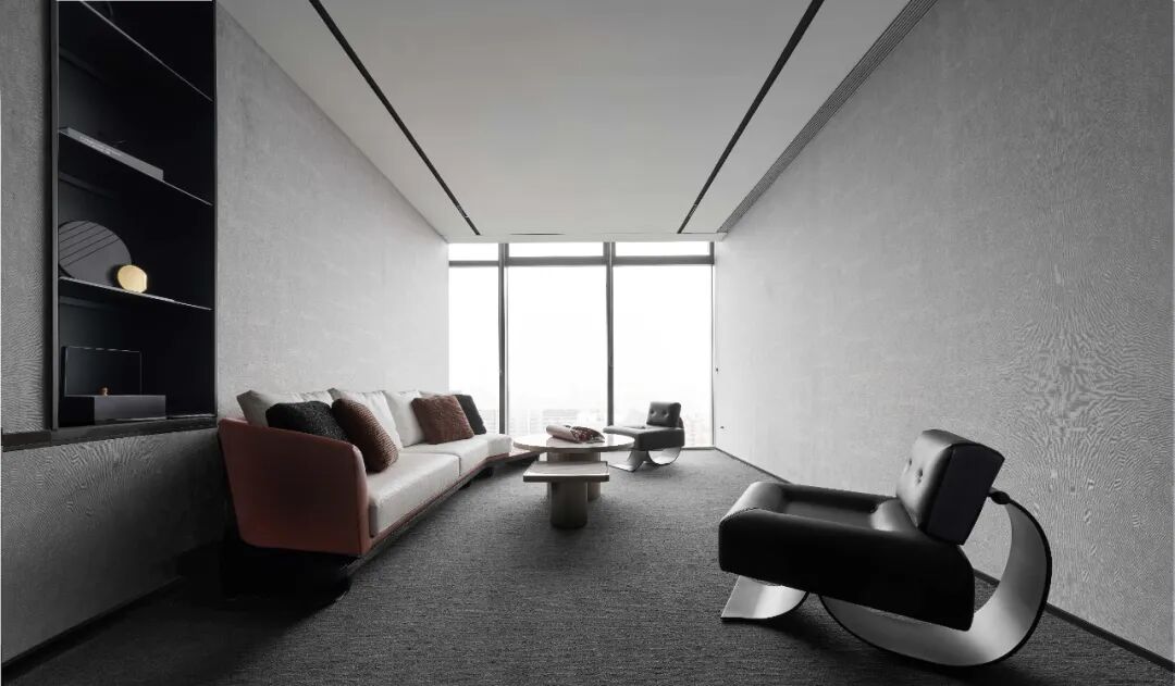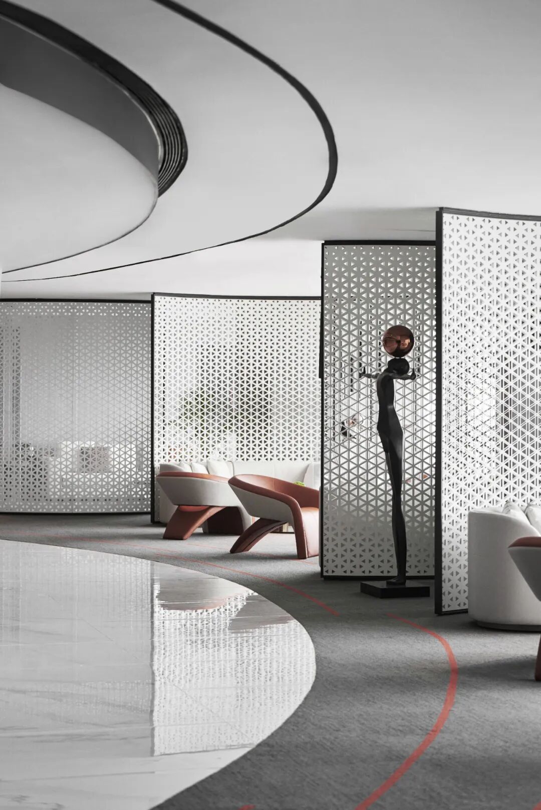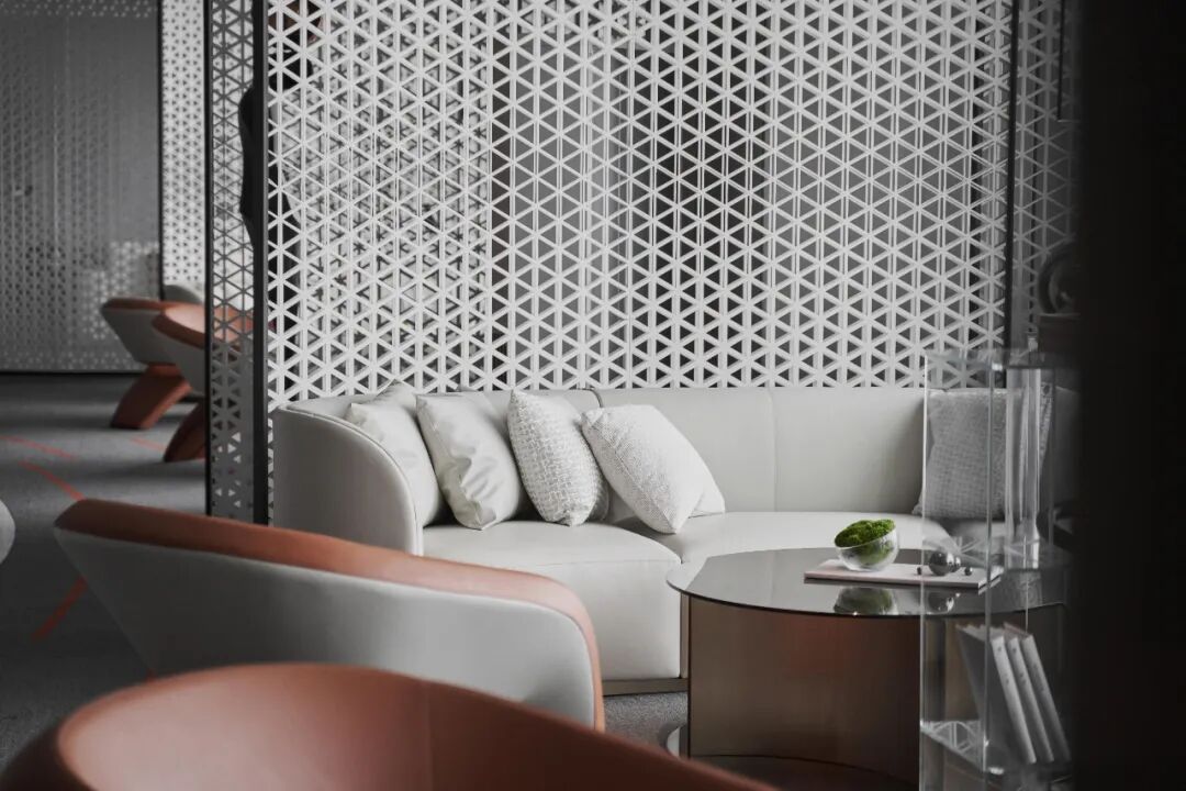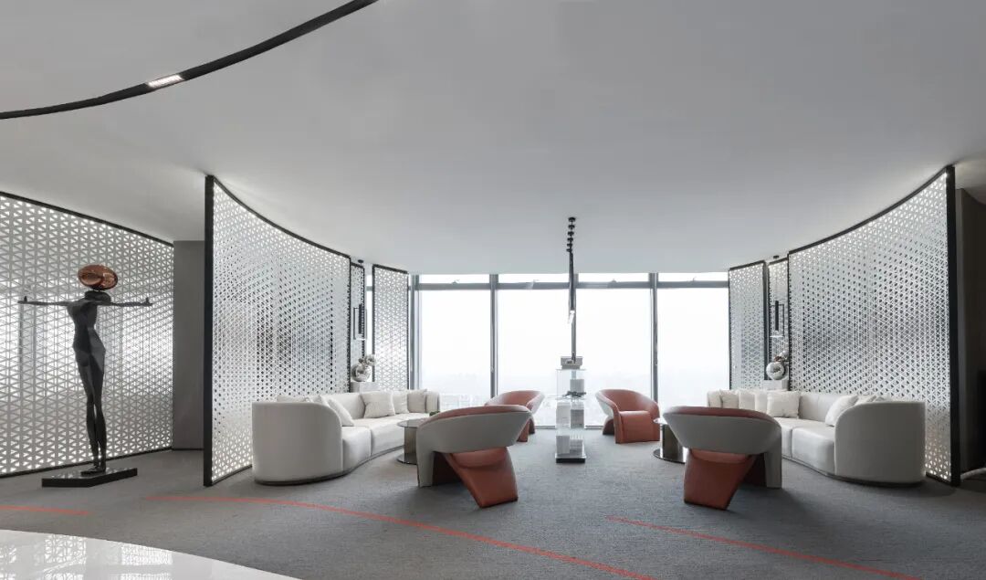 由渐变编织的屏风围合而成的半开放洽谈区,私密而舒展,轻透而惬意,与窗外的天际繁华相得益彰,让人对未来充满无尽畅想。