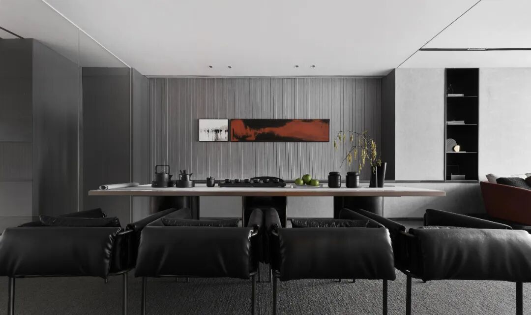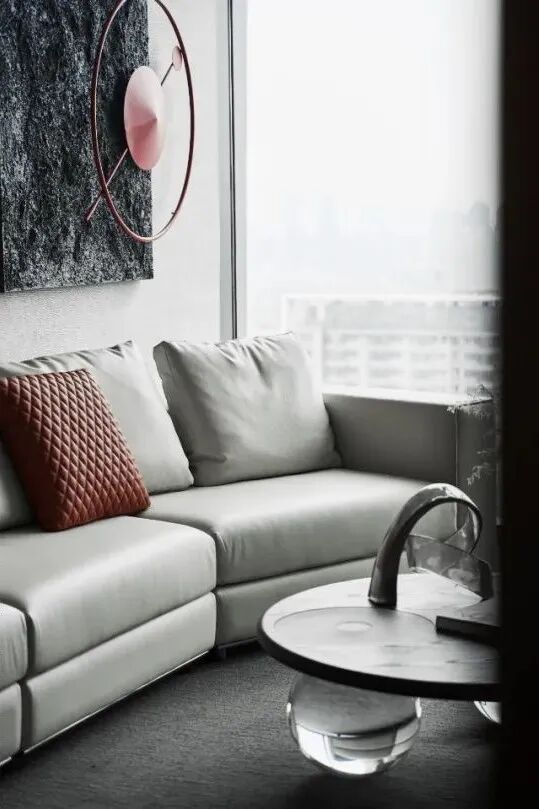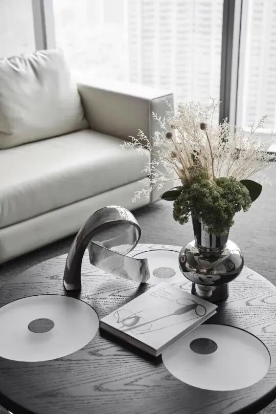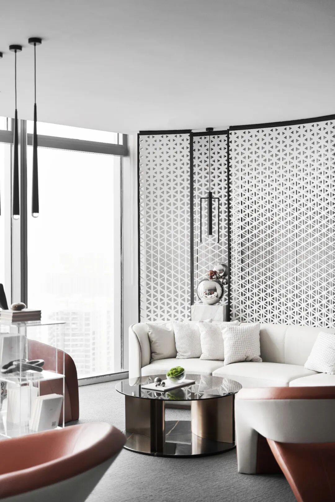 轩朗透亮的落地窗带来的繁华瞰景,赋予空间高奢端然的气质。而柔和流淌的光线给静谧硬朗的空间增添一份趣味,形成虚实相交的视觉层次,令人回味无穷。