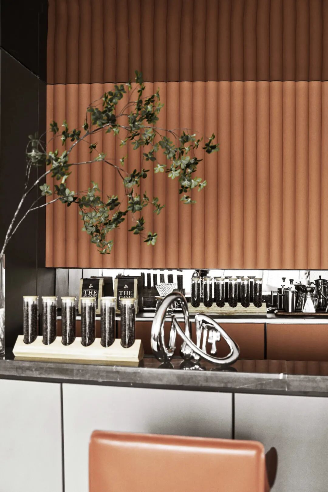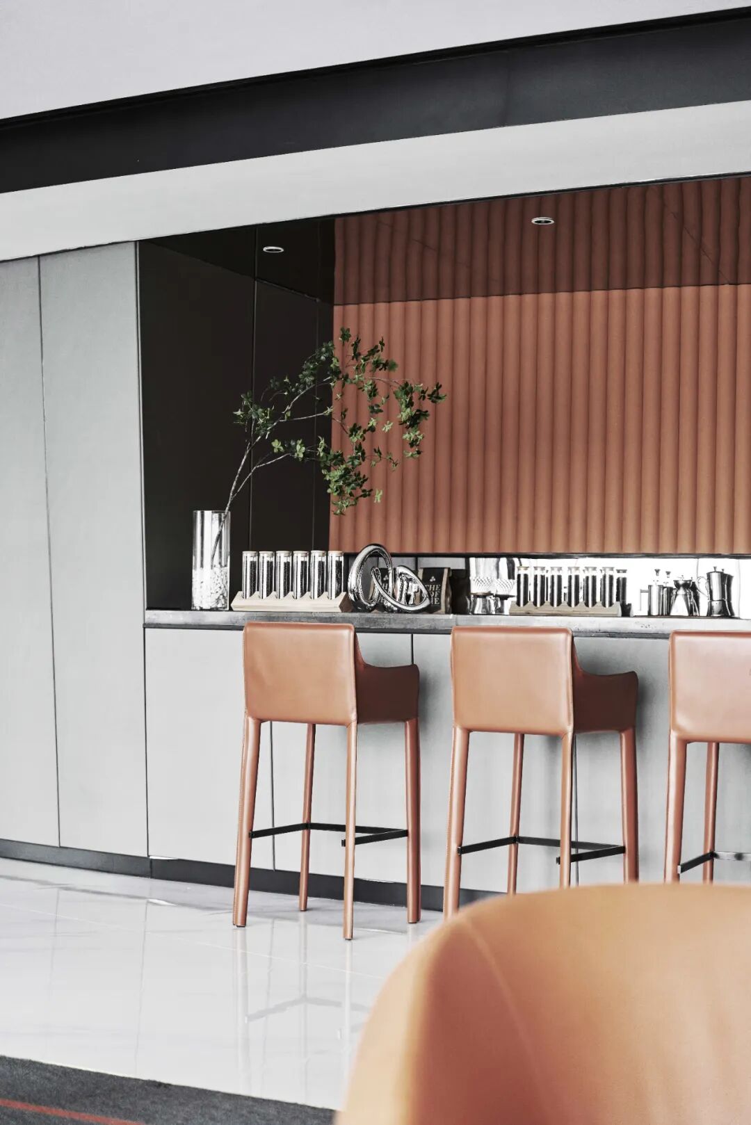 水吧区的整体构造承接弧形空间形态,大片绅士灰铺陈,奢想豪华待遇,贴心极致,细腻入微。