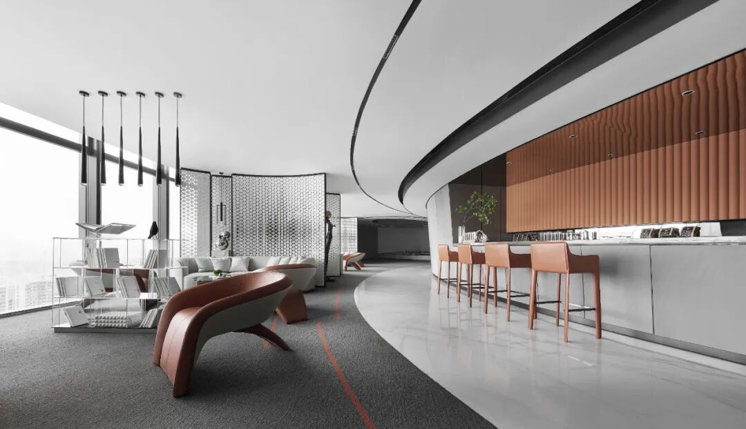 顺着流畅灵动的曲线前行,半开放的洽谈区与水吧区一览无余。