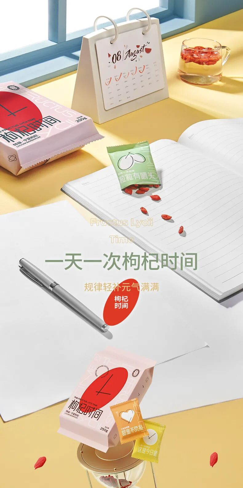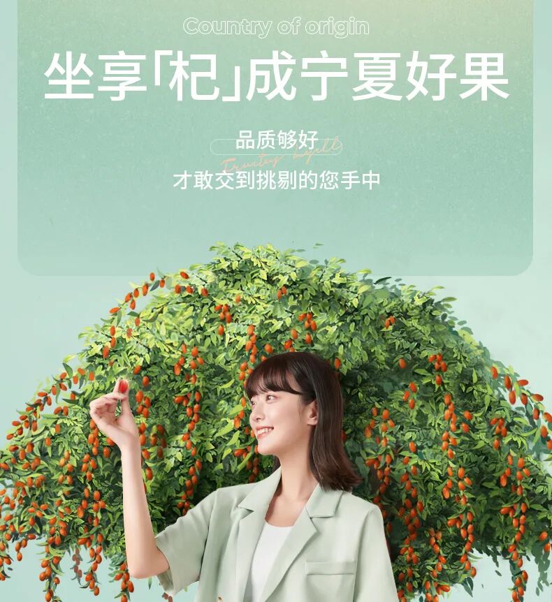配色上也值得一体,枸杞本身是红色,这款详情页背景运用了大量的绿色,红配绿的视觉效果非常漂亮。整体的品牌调性也出来了。