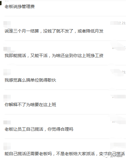 还有一位群友是很早之前爆料出来的了。一天,他们公司领导决定让全员自己当老板,自己出去揽活,揽活回来再自己设计,20%归个人,80%上缴院里。真正做到了让员工自负盈亏,自己是自己的第一责任人。听了这事儿真是觉得可悲又可笑!所有员工都一脸懵:我为啥要在这上班?我自己又能揽活,又能干活,为啥还要再给院里?院领导的答复是:你们格局太小了!这样的老板倒是很会玩呀,稳赚不赔,格局是很不一般。