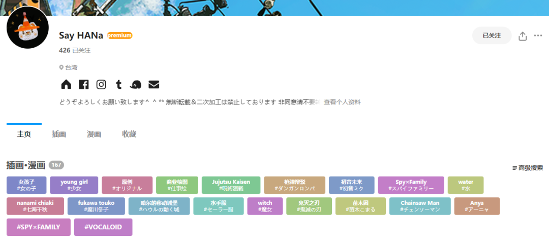 Say Hana的作品主要以清新或是古风美少女为主,画面充满了浪漫和调情,用色总给人一种惊心动魄的美感。画风时而古风,时而现代,又时而欧美,令人捉摸不透~作品起名也很用心,看到她的作品总会感到很温暖,很清纯。由于涂法非常强调在体脂感上的表现,所以角色更能明显感受到人物真实感和脂肪的流动感。