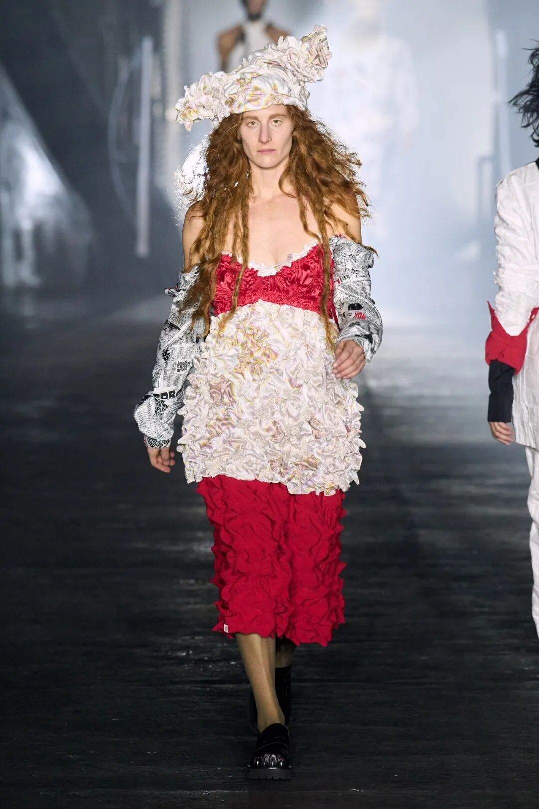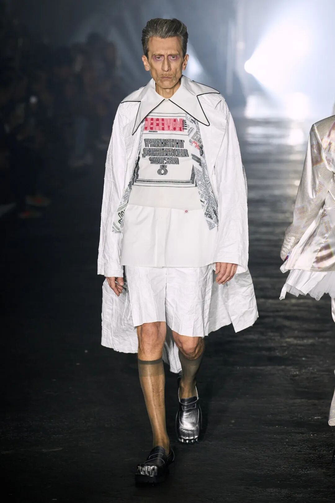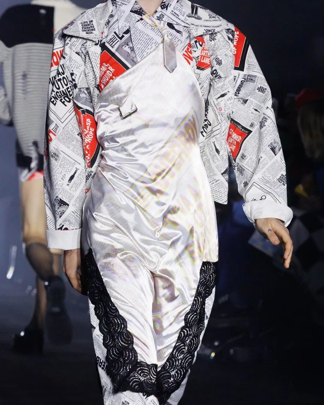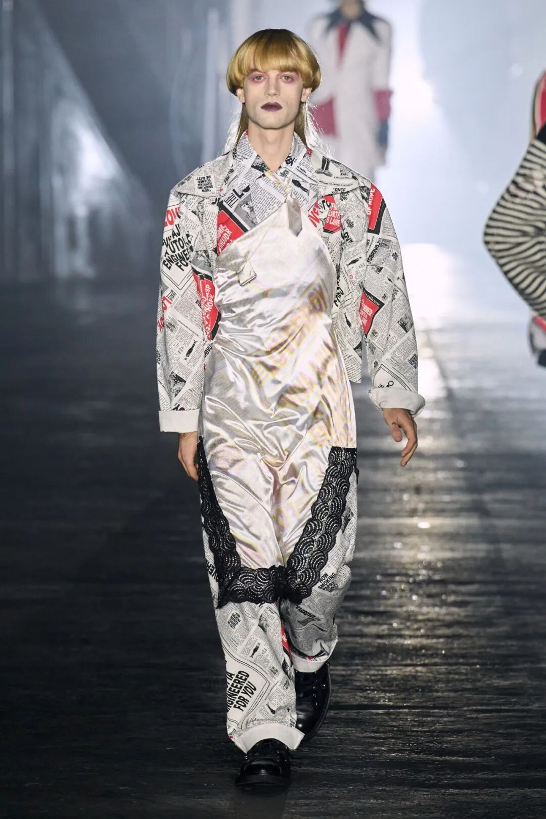 三种人依次呈现,开始是穿着保暖层、防护装备和重新加工的订书钉的工人,而时尚的剪裁、超大的荷叶边和华丽的印花则是“装模做样的人”的特色,他们穿着令人生畏的爪足鞋。对于传播城市新闻的主要八卦商人,设计师采用不饱和的调色板为剪裁精良的粗花呢和潦草的星星图案提供了基础,随后让位于鲜明、没有灵魂的白色和新闻纸色调。