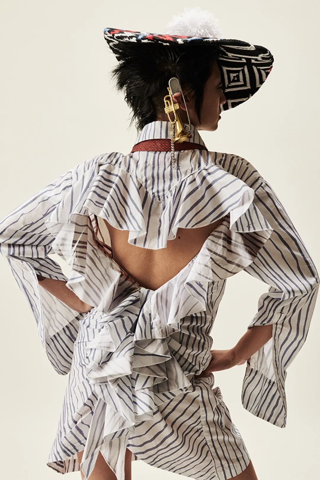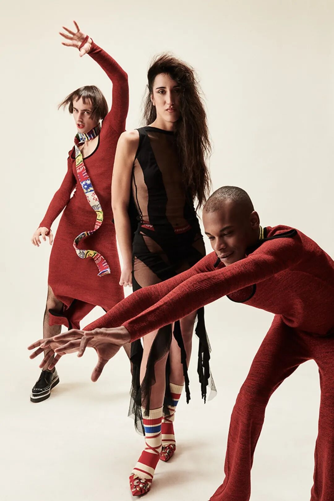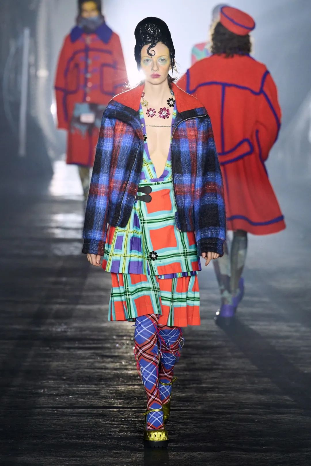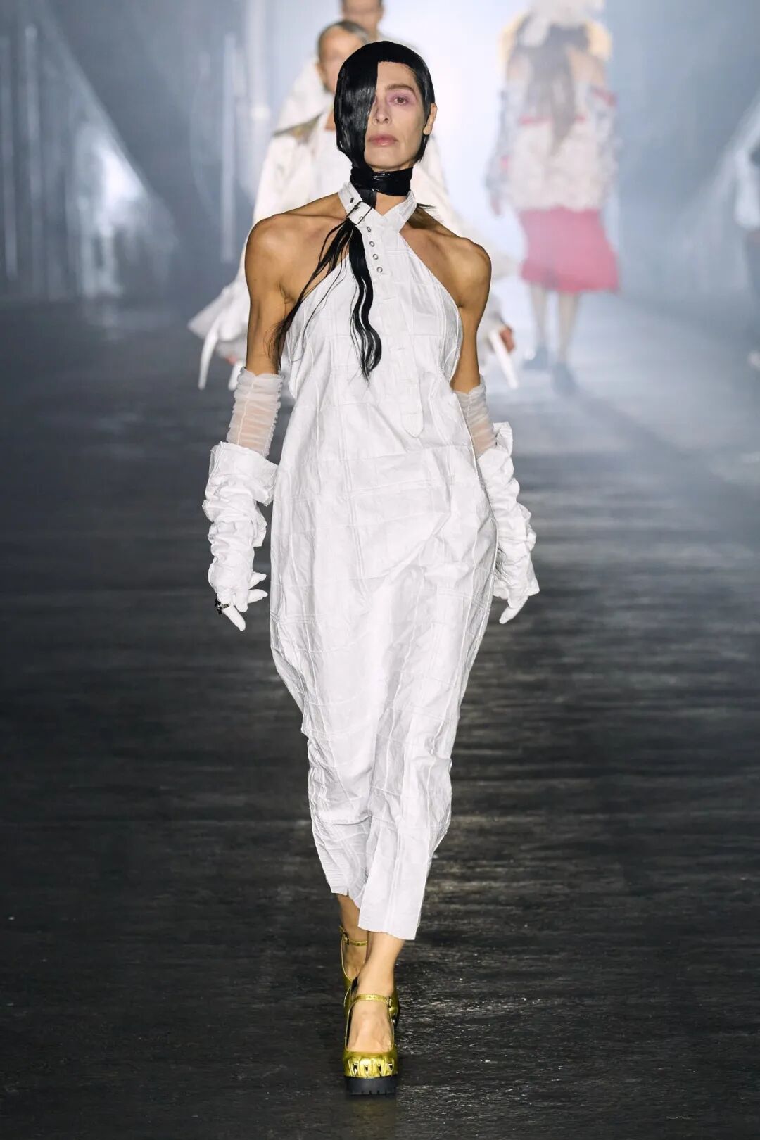 三种人依次呈现,开始是穿着保暖层、防护装备和重新加工的订书钉的工人,而时尚的剪裁、超大的荷叶边和华丽的印花则是“装模做样的人”的特色,他们穿着令人生畏的爪足鞋。对于传播城市新闻的主要八卦商人,设计师采用不饱和的调色板为剪裁精良的粗花呢和潦草的星星图案提供了基础,随后让位于鲜明、没有灵魂的白色和新闻纸色调。
