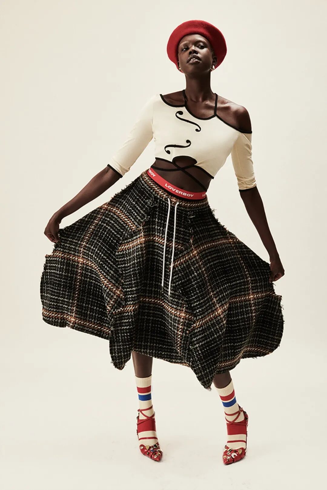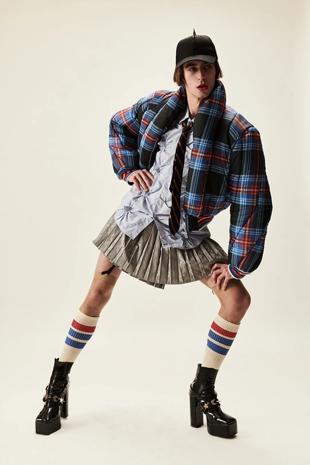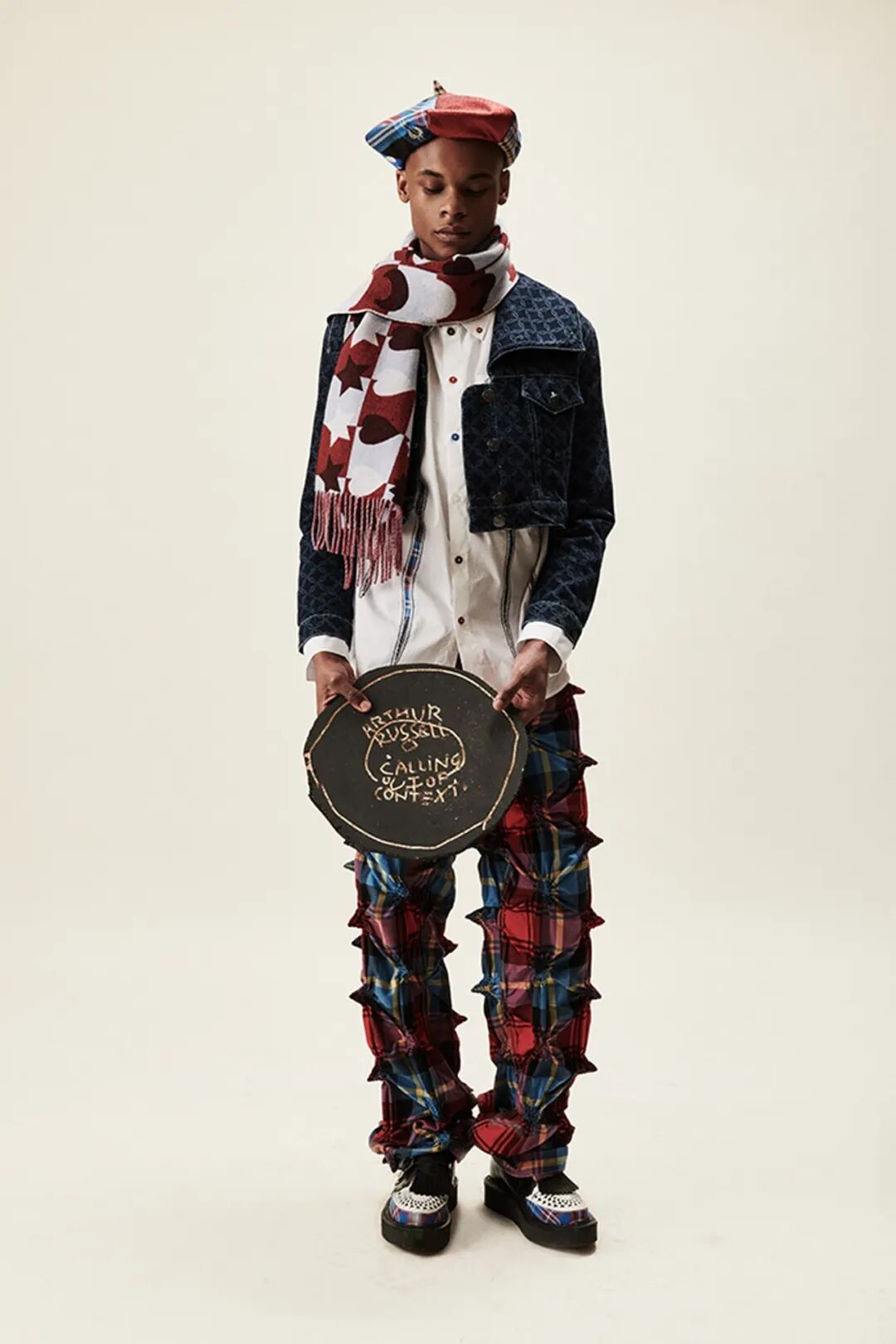 2022AW系列,保持有趣、搞怪、自由 DIY创造的设计风格,但它不是一场一次性的实体时装秀,而是有条不紊地同步录制2022年风格的影片,本季的3D苏格兰格子呢布满了尖角褶皱设计,手绘印花牛仔和卡通loverbov 啤酒罐插画针织,重申 Charles Jeffery对嘻哈说唱朋克的感觉。他的标志性畅销 Ears 无檐小便帽再次出现。