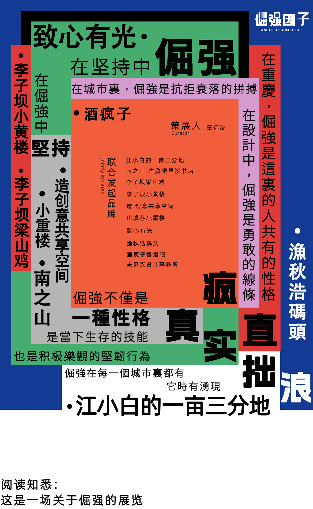 《倔强因子》是由江小白的一亩三分地,致心有光后堡社造中心,李子坝小黄楼+李子坝梁山鸡,南之山·古腾堡星汉书店,酒疯子自然酒吧,渔秋浩码头以及小重楼+“造”创意共享空间这七个独具自我文化内容的场地联合发起的一场共创、共建、共享、共用的展览。