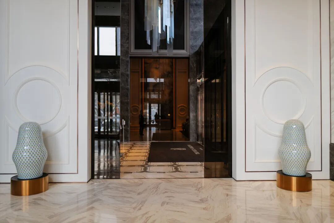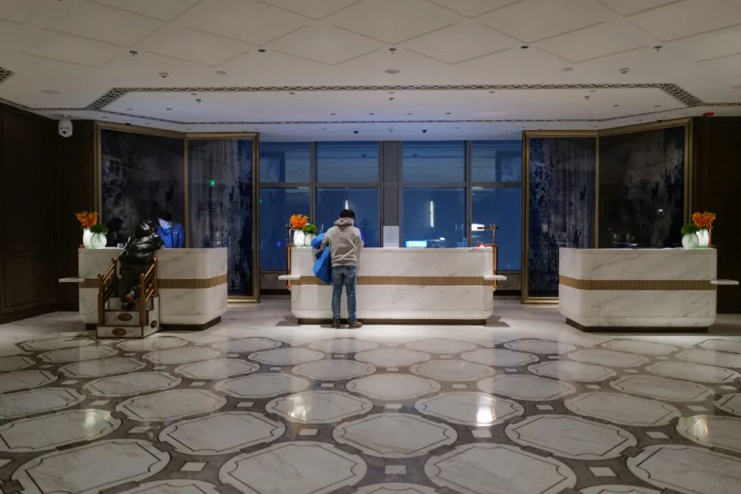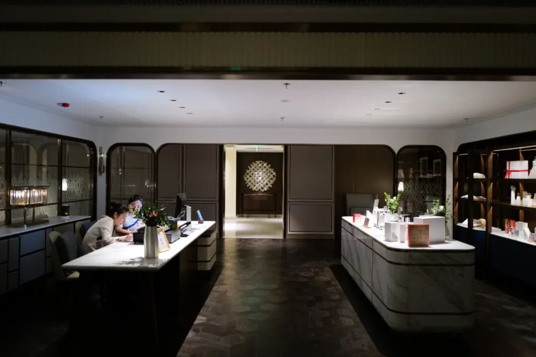 尽管酒店选址在闪耀夺目的冰城新晋地标,但酒店的入口格外隐秘内敛,迂回的车道和苍劲的松树把酒店入口处理的低调深邃。酒店底楼的到达厅与落客车道间隔着一道严严实实的挡风厅,加之入户旋转门尺度精巧、雨棚和前厅的照明系统的亮度都相当克制。当我下车后,感觉自己抵临的一座静谧的私邸,其透露的温情暖意让我忽略了那一刻零下十数度的户外低温。