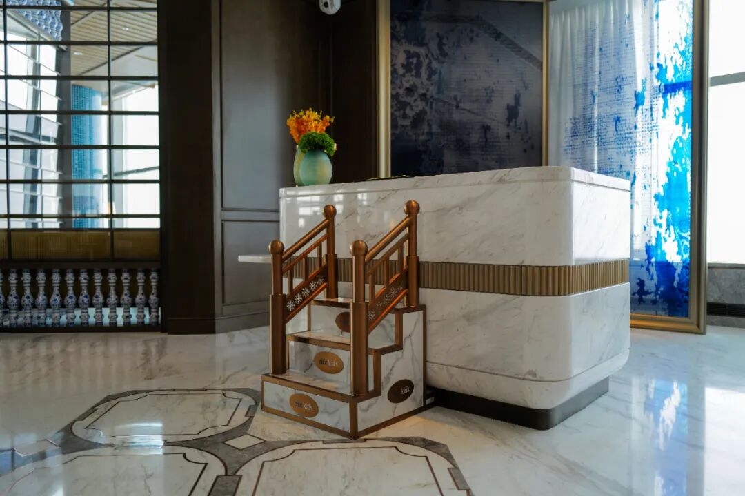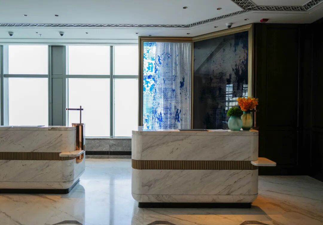 空中大堂层并未强调炫技或出圈,接待厅用满目白色大理石烘托冰雪之城的底色、在面窗位置设置了三尊船型中岛接待台呼应一窗之隔的松花江。