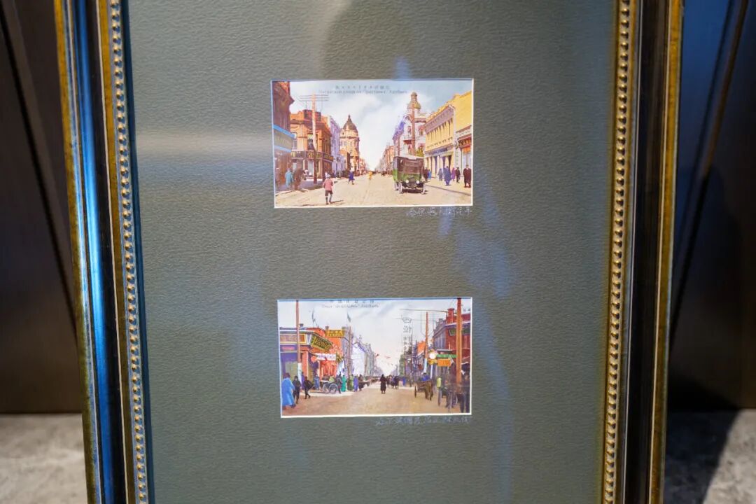 ▲ 哈尔滨街景老明信片、整块原木制成的不规则长桌,致敬着本地人文与自然。