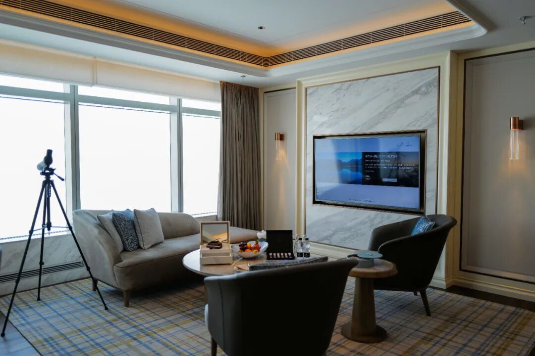 我有幸体验到了酒店特色的入户入住办理,进入4329号的行政套房后,更像是在参观一座兼具瞭望台属性的私人艺术空间,身着带有别致斗篷设计的制服的“淑女”Caroline把散落房间各处的艺术品所蕴藏的寓意和工艺一番细致讲解,也高度趣味性地讲解了视野范围可见的重要建筑物和景点(包括冰雪大世界和“剪刀桥”),一扫传统客房讲解的公式感。