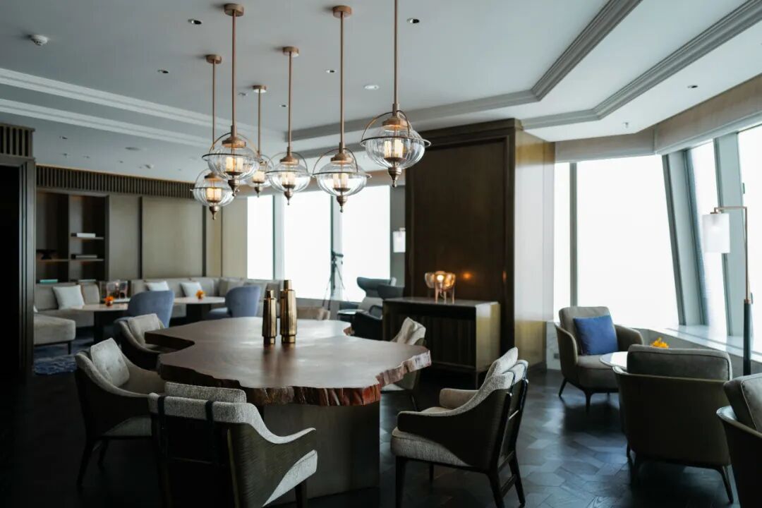 独占空中大堂层(54F)一边的大堂酒廊,有着交织着金属构造和玻璃的入口,也有着超高的挑空、环绕式吧台和下沉式瞭望座席,是理想的下午茶和晚间小酌据点。