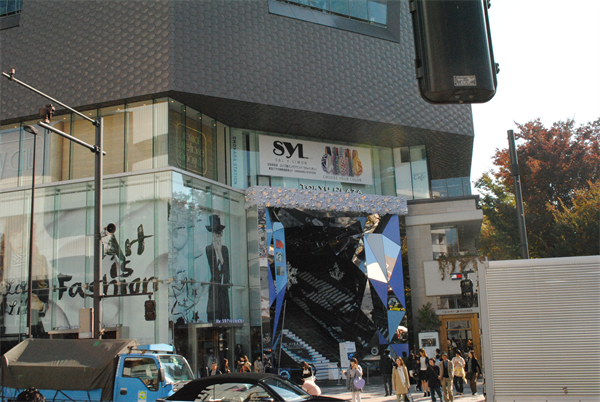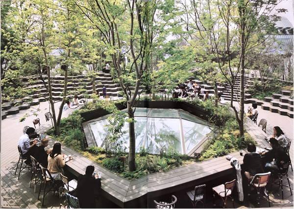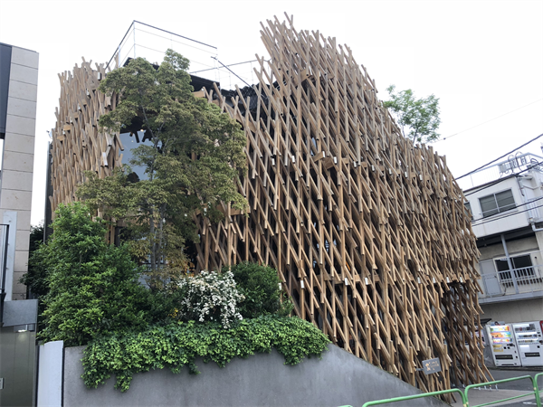 这是一个位于东京表参道和原宿交叉点的商业建筑。建筑的外立面强化了原来石垣的历史建筑的符号,并且建筑物的体量高出街道的其他店铺,形成了独具特征的建筑立面23。笔者曾经多次经过和到访过这个建筑,三层以上建筑吸引人流的主要入口设置了一面万花筒的棱镜,人们在乘坐的扶梯的时候获得了独特的购物空间体验。屋顶花园也设置了一个多边形的钵,人们围绕着这个钵坐下来休息,在几乎千篇一律的大都市购物体验之后也短暂地体验了屋顶花园的人工小自然空间。