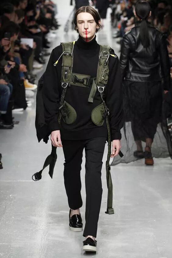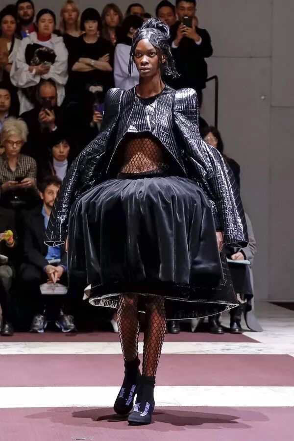 一套全黑、无定型的服装,装饰着不对称的褶边、古怪的飞边与破碎的布料,这种标志性的风格将街头文化与高定相调和,川久保玲最擅长“打破一切再创造”,川久保玲用“致命武器”——盔甲、朋克以及强硬的廓形,告诉我们女战士就是要斗争到底!