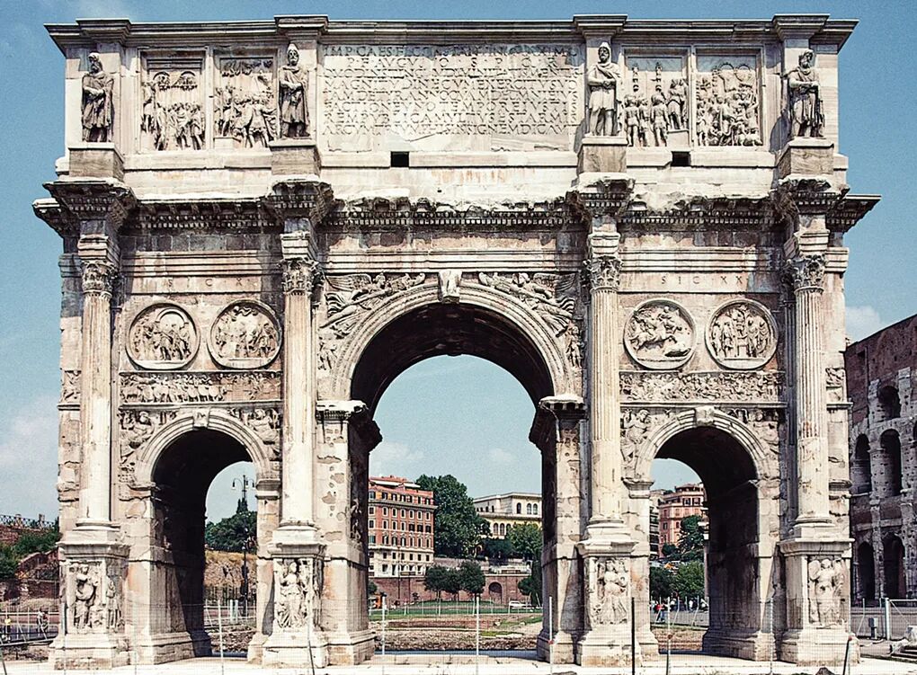 公元315年,元老院和罗马人民在斗兽场附近建起一座三拱的君士坦丁凯旋门,纪念君士坦丁即位10周年和战胜对手马克森提乌斯。