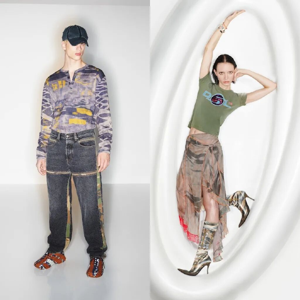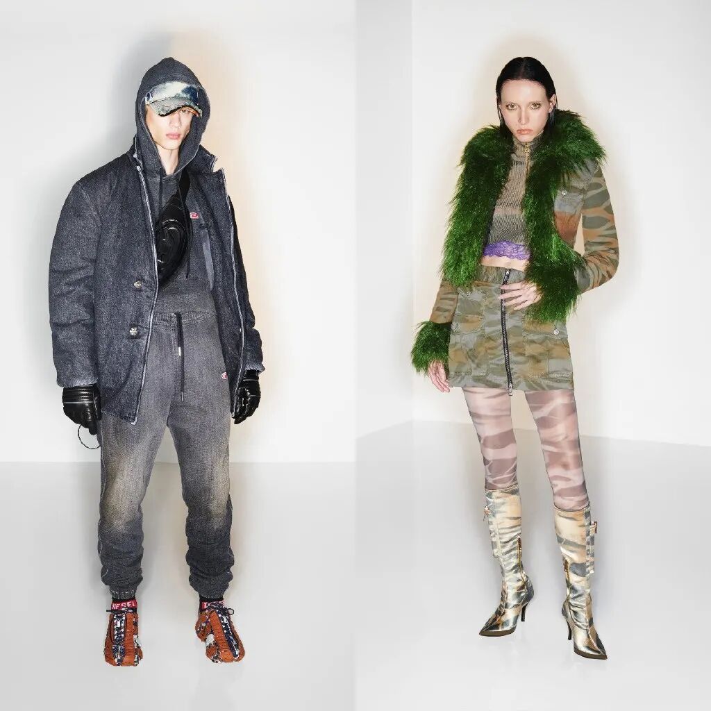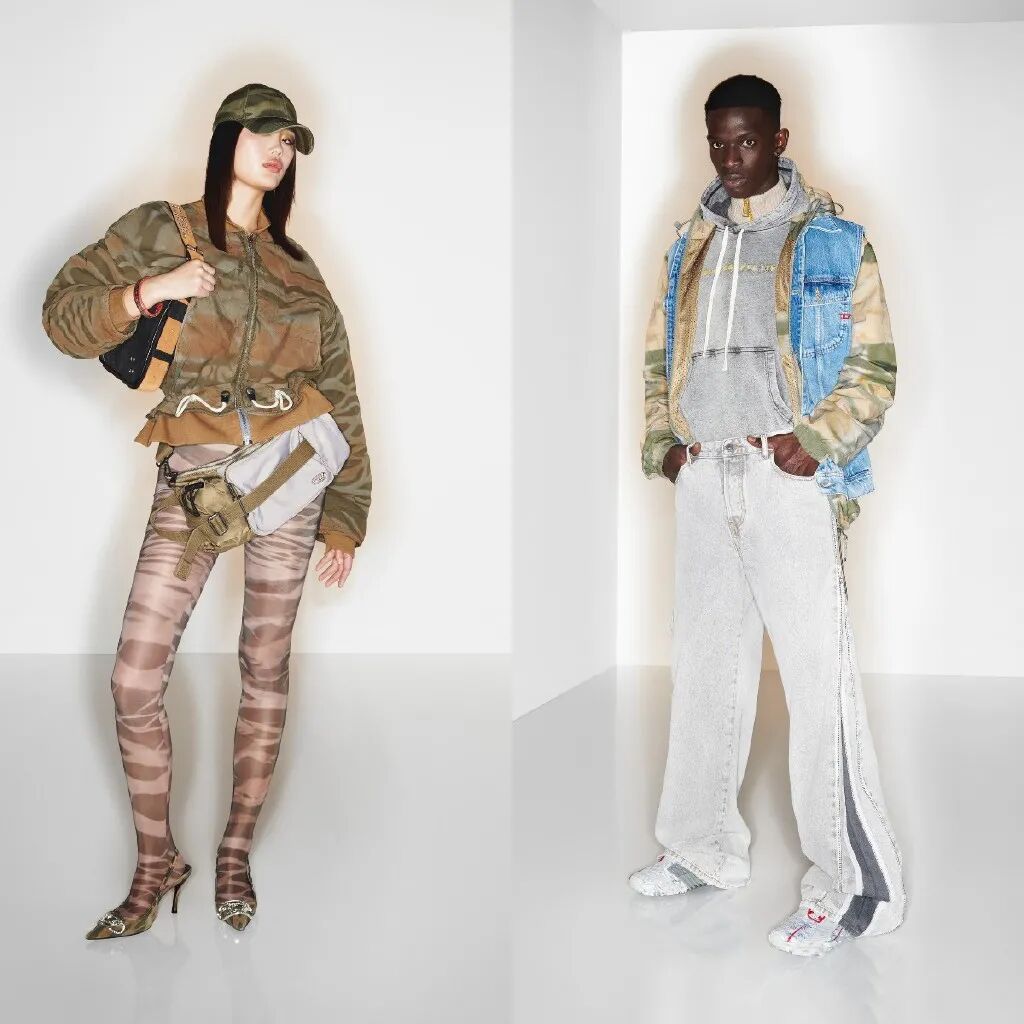DIESEL 2022 早秋系列值得关注的服装流行趋势元素:迷彩印花、漆皮元素、赛车元素、低腰设计、不规则剪裁......