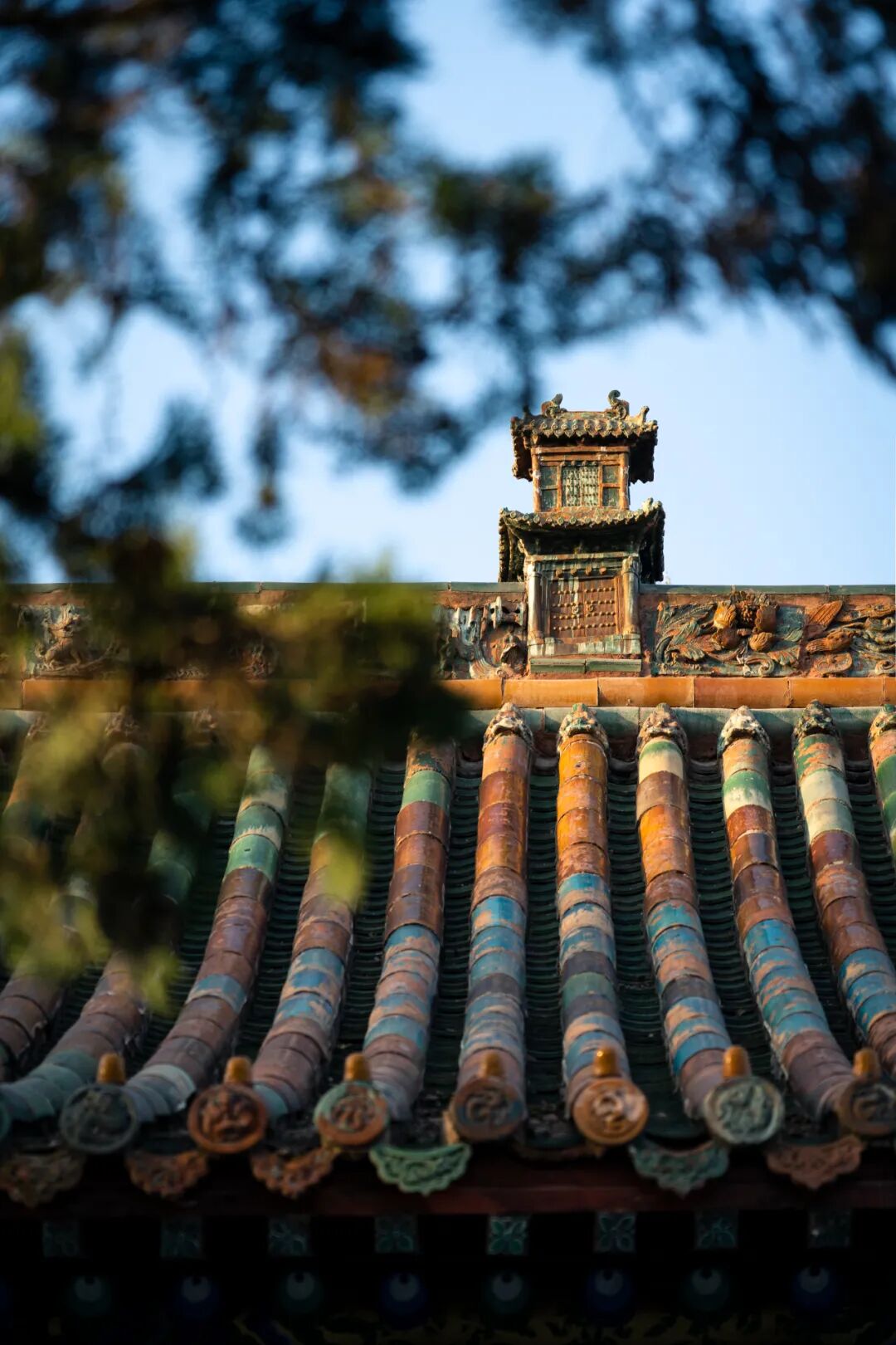 楼阁为基座上二重檐四角攒尖顶,挑角花脊,上立脊兽,琉璃瓦剪边,顶镶宝瓶。