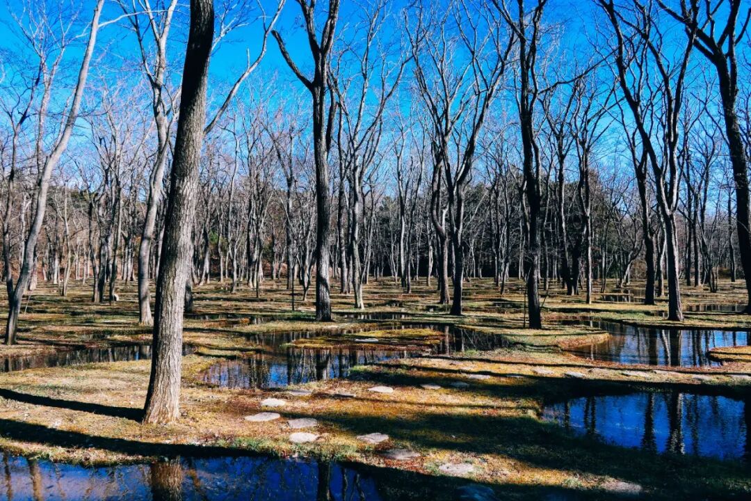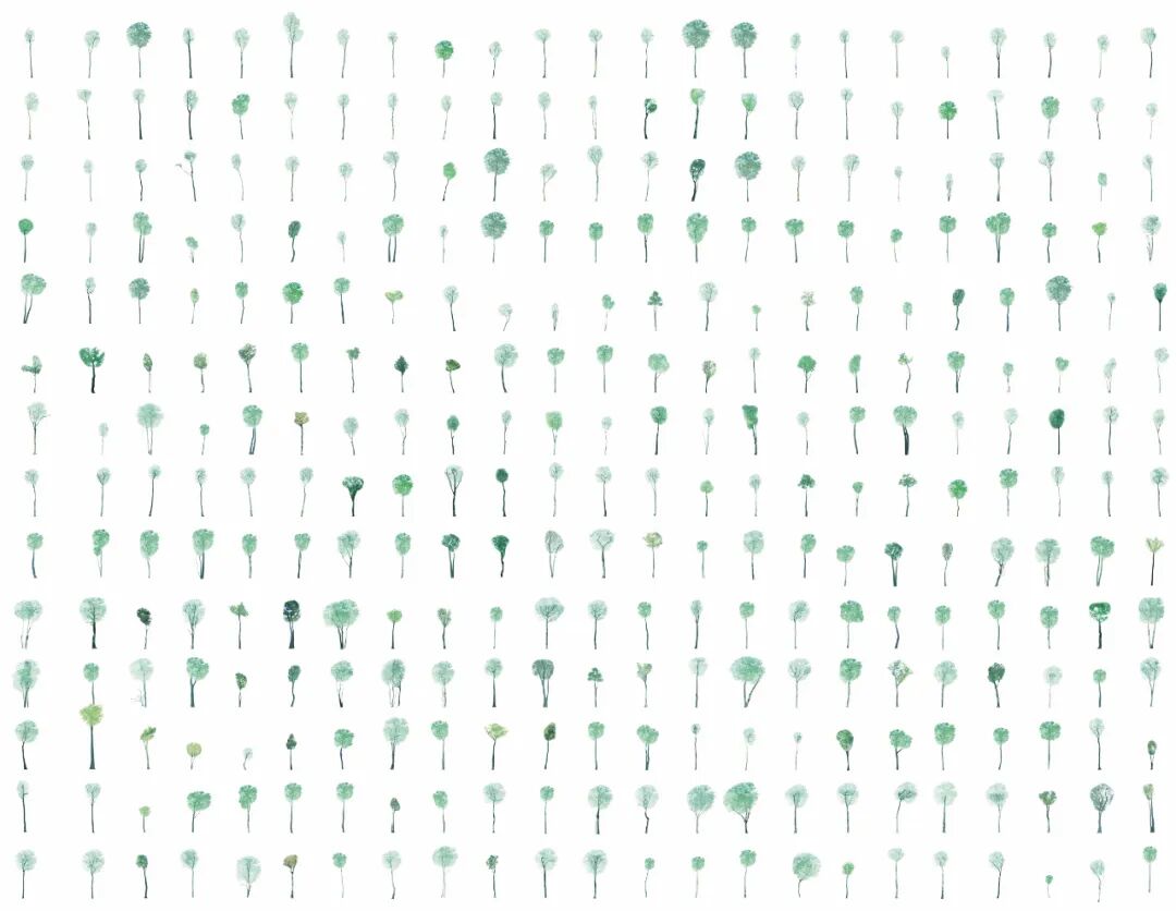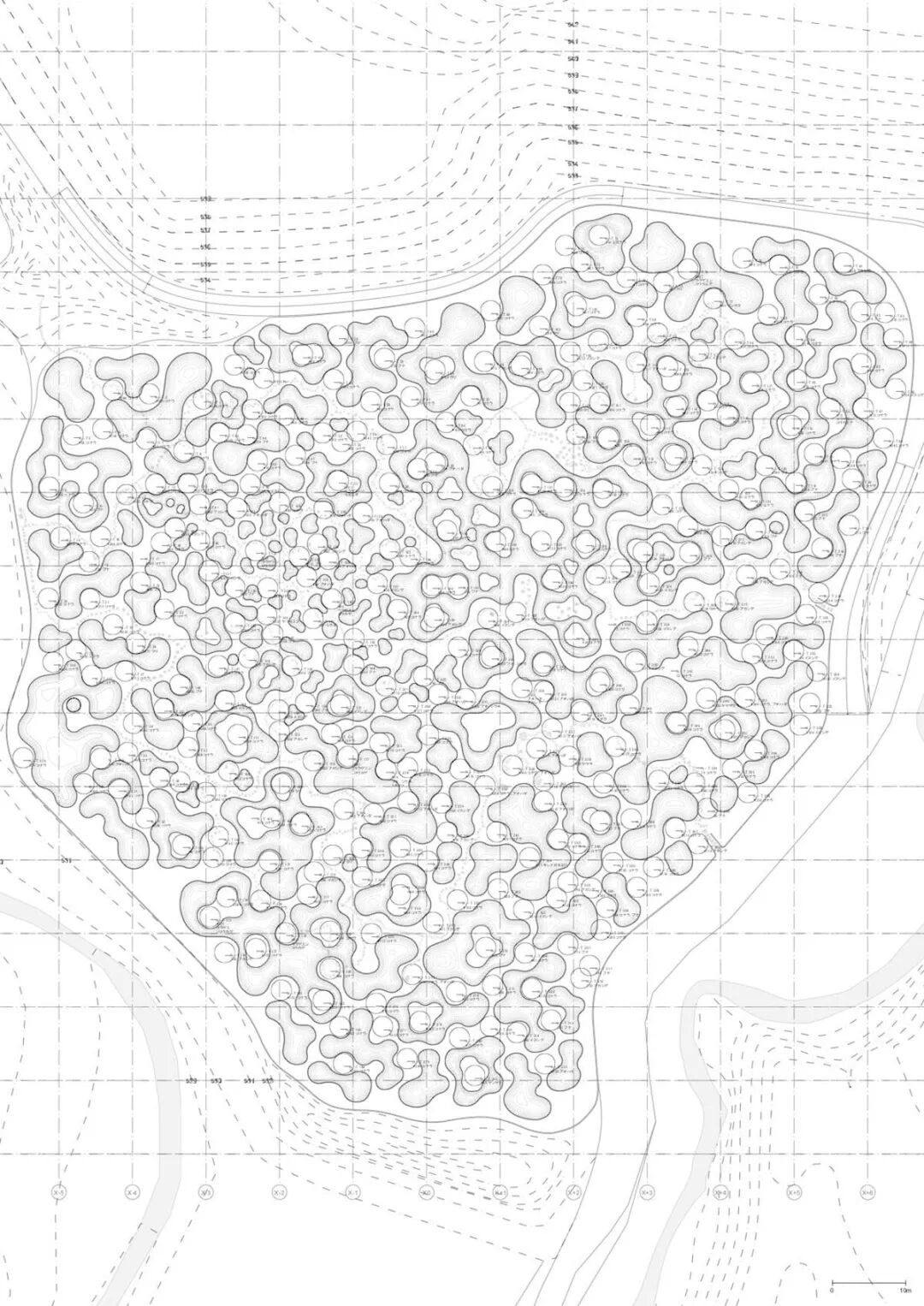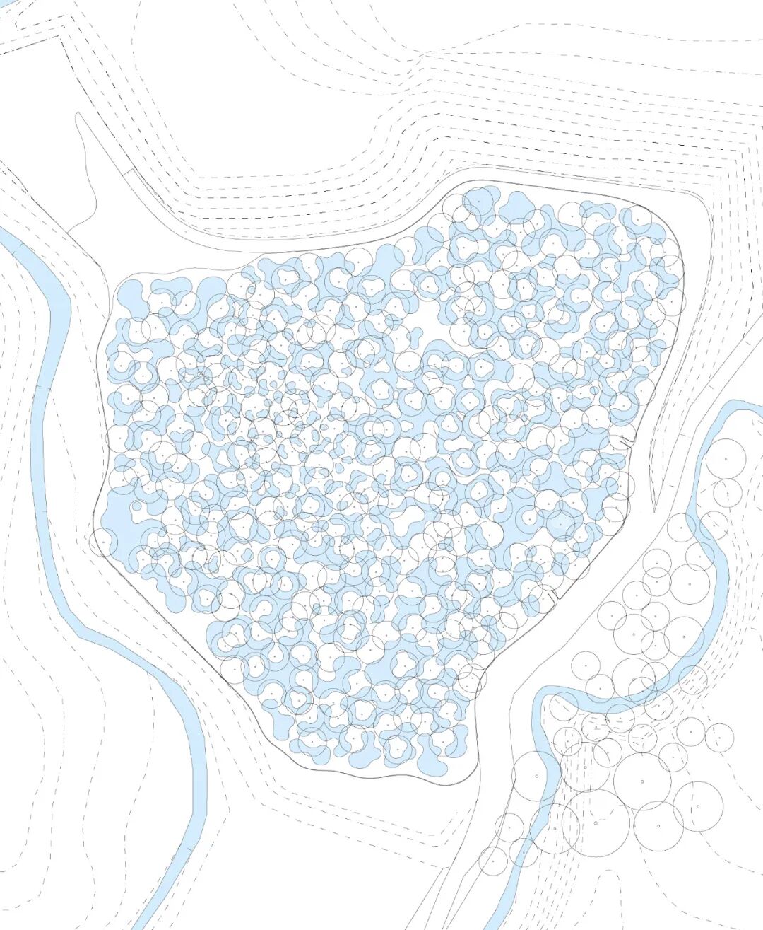 ✸ 树木与水池的形状经过精心设计,为模糊的自然边界赋予明确框架。把森林移植到邻近位址后重新排列,如同拼图般,每一块拼图都具有深意。由此,每一棵树都具备了自己的特征和自己作为自然一份子的角色定位。三百一十八块独特的树木拼图之间,点缀以明亮的空地。树与树之间错落着一百六十个水池。移植过来的树都是落叶木,包括山毛榉、栎树等等。若是在自然环境,这几种树都无法跟水近距离共存。因此树池都做了防水处理,才得以创造出自然界从未存在过的新共存关系。