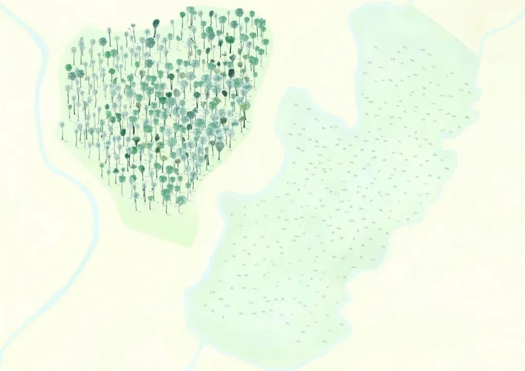✸ 临近的新度假村的原址也是一片森林,兴土动工必会砍去许多树木。由于林地与水草地的面积几乎相同,因此石上纯也决定将树木全数移往水草地种植。而这片水草地的转变不光是移植过来的森林,也将是两处场地的历史的层层叠加。