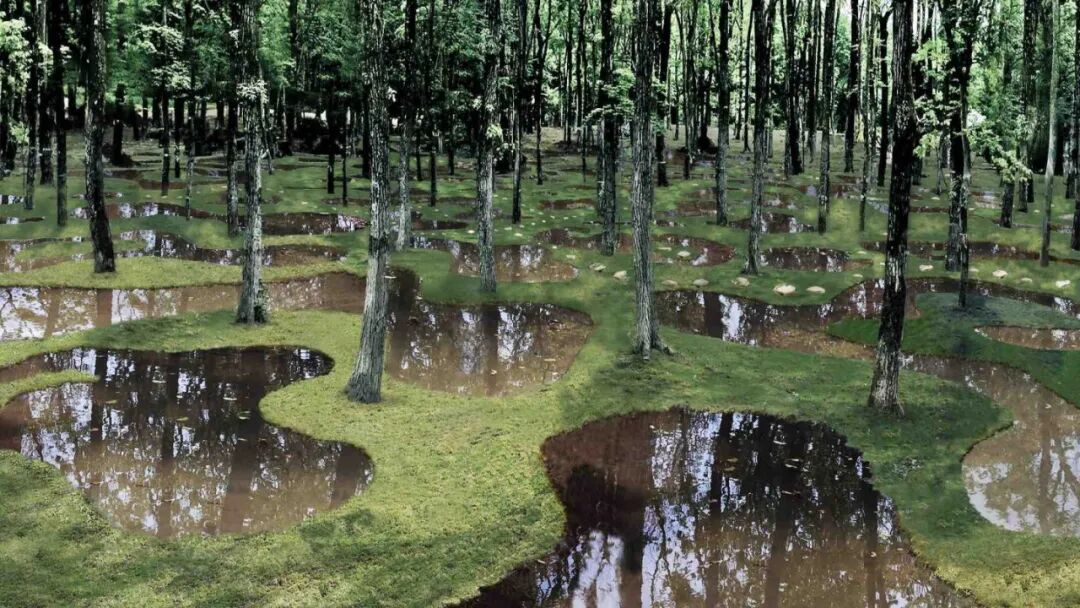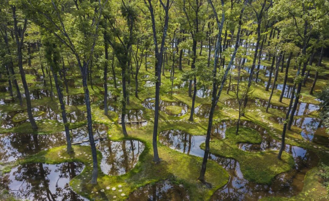 ✸ 过往这些地景从未邂逅与融合。树木移植过来后重新排列,原有的水闸将水引入,填满无数个以既存灌溉系统相连的水池,流水以不同的速度潺潺流动。树与水错落交织,紧密相连的程度是自然界所未见。美丽的苔癣铺满树木与水池间的空地。这片密林无须增减半分,前所未见的自然新景已跃然成形。景观规划与建筑设计融为一体。