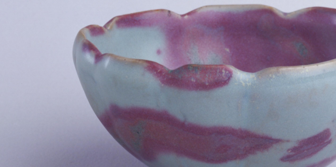 此碗造型别致,宛如一朵盛开的花朵,妩媚多姿。蓝、紫相间的釉色,又如同天空中飘浮的彩云。