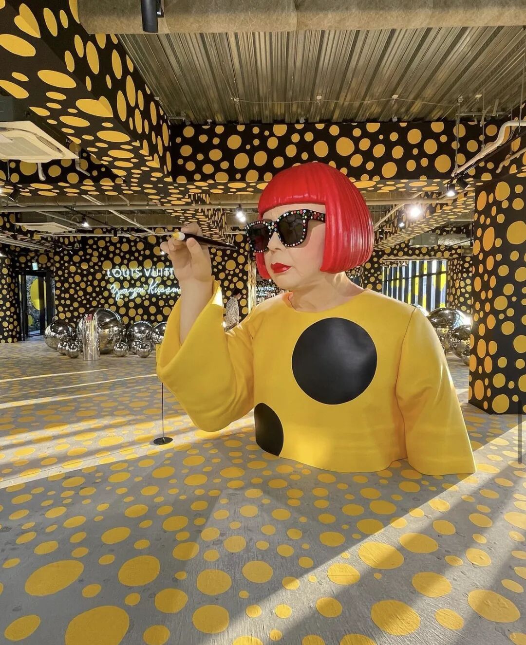 洗眼2023-11-22 巨人“草间弥生”占领城市!有人疯狂掏钱,有人惊呼吓人!(胆小勿入) 路易威登与艺术家和设计师合作是品牌的一个传统,可以追溯到品牌创始人的孙子加斯顿-路易威登 (Gaston- Louis Vuitton )。2023 伊始,路易威登和草间弥生时隔十年再度合作,其中包括多种艺术装置。 这次联名,“波点风”不仅席卷了整个时尚圈,甚至占领了各大城市。用3D形式搬上新宿车站东口广场的广告牌、把人形装置安在巴黎路易威登总店外墙上...大屏广告更是遍布全球。路易威登用这种大规模宣传的方式,来纪念与草间弥生合作的十年,也让今年这位93岁的艺术家给时代留下浓墨重彩的“波点”们。 不过这密集的彩色波点大规模地涌上街头,有人被治愈,也有人惊慌地算不出心理阴影面积。 01 波点艺术席卷全球 法国巴黎 全球最大的路易威登总店坐落在法国巴黎香榭丽舍大街101号,1914年建成,至今已有上百年历史。但是最近要是路过这座古老的建筑,千万别抬头! 图片中趴在墙上作画的“巨人”,就是“正在给路易威登大楼画波点的草间弥生”。这座典雅建筑的墙面上成了艺术家的画板,被点上了密密麻麻的彩色波点,乍一看颇有节日氛围。但当你走近建筑物,抬头仰望建筑上方巨大的“怪婆婆”充气装置,原本的理智再也压制不了面对可怕巨物时内心最原始的恐惧与焦虑。 日本东京 路易威登在新宿车站东口广场前的广告牌上,投放了一支片长1分钟的路易威登 X 草间弥生联名的裸眼3D广告。动画中首先出现的是带有波点的路易威登联名行李箱,打开后出现了3颗草间弥生著名的南瓜作品,而当中间的一颗转过来,才发现那正是草间弥生!她抻着头向下望,目光匆匆地扫过人群。 从3D立体屏幕到整栋楼梯都跃上色彩缤纷的圆点,让大众久久沉浸在草间弥生创造的艺术世界中。 以埃菲尔铁塔为灵感的通讯塔东京铁塔旁盛开着一朵“巨大南瓜”,婴儿车里的小朋友也能看到的铬球雕塑和南瓜形状热气球。 东京站的艺术装置还有一辆鱼形餐车。 在每个地点,AR 滤镜都能解锁生动的动画,其自拍功能将让参与者融入想象中的角色或试戴路易威登 x 草间弥生的虚拟物品。 美国纽约 2013年的波点章鱼 1957年,草间弥生来到纽约。这座城市给予了她宝贵的机遇——她遇到了艺术家的最好时代,此时的纽约是生机勃勃、充满创造力的,是所有来纽约的艺术家的时代。 “纽约滋养了我。”她对日本的杂志说,她要创造一场艺术革命,“将震惊整个纽约艺术界”。 有没有震惊整个纽约艺术界,那是后话了。但草间弥生在路易威登纽约旗舰店橱窗作画的一比一还原机器模型,超逼真的面部神态足以震惊过往的行人。 “可爱”与“可怖”一字之差,这个机器装置将纷繁的色彩、充满童趣的符号、古怪的人物神情进行全新的组合。 02 最受争议的波点女王 全球最贵女性艺术家、最伟大的精神病艺术家 草间弥生以其目眩神迷、绚丽多彩的艺术风格闻名于世。2016年,草间弥生被美国《时代周刊》评选为“全球百大影响力人物”之一。 草间弥生于《Yellow Tree》家具展厅 草间弥生与波点创作彼此成就,常人眼中平凡的波点对于草间弥生来说,这不仅仅是图形、色彩,而是她眼中的世界;当经典的波卡圆点融入高强度颜色的艺术媒介之时,生命力呼之欲出,极具辨识度的作品衍生一种熟悉感,如今每次看到波卡圆点都会联想到草间弥生的名字。 正是用这种独特大胆的艺术表达手法,草间弥生被评为全球最贵女性艺术家、最伟大的精神病艺术家。 在草间弥生对自己的描述中,她则称呼自己是是一位“精神病艺术家”。偏执的幻觉与她如影随形,特定图案无限反复、增生、繁衍,直至布满整个画面。 草间弥生,《无限镜屋:阳具的原野》 父亲的浪荡与母亲的哀怨充斥了草间弥生的童年。父爱的缺失,母亲的殴打,在长期的精神压力下,草间弥生出现了视听障碍。在她的世界里,所有的东西都好像穿着一层充满圆点的皮肤,还能听到植物讲话,那些静物在她的世界里却都鲜活起来。 草间弥生年幼时期作品 草间弥生的与众不同让母亲将十岁的她送进了精神病院,不被理解的她在成年后选择背井离乡,经历了被嫌弃的、受穷的、孤苦无依的大半生,但这没有让草间弥生停止她的创作,她将眼中的世界展现在画纸上、雕塑中,流露出循环的时空感虽然难易被人们接受,但都能真切感受到波点世界的生命力。 03 真实与虚幻世界的“骑墙者” 草间弥生晚年出名后,背负了许多争议。蔡康永曾形容她:“草间弥生不知是在哪面墙上钻了一个洞,窥知了造物者的某个手势或背影,她从此寄居于这面墙上,在两个世界间来回顾盼。” “世界以痛吻我,我要报之以歌”了解草间弥生时,不自觉浮现这句话。一个受尽生活苛待的孩子,在极度的痛苦里不懂如何用言语描述心中的苦痛与疑虑,为了活着,与生俱来的防御机制将她所处的世界进行“美化”、“装饰”。草间弥生将灵魂附着在画笔上,把她眼中的美丽世界,分享给世人,试图给她人以慰藉。波点是她人生的救命稻草,是她倾诉的窗口,也是她送给世界的礼物。 抛开商业目的及成见,重新观看这些被巨人化的艺术装置,草间弥生寄居在墙上,以类似造物主的方式去观看这个世界。 本文来自微信公众号“青年建筑”(ID:i80arch)。大作社经授权转载,该文观点仅代表作者本人,大作社平台仅提