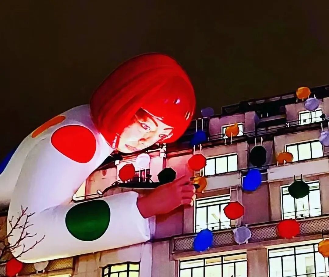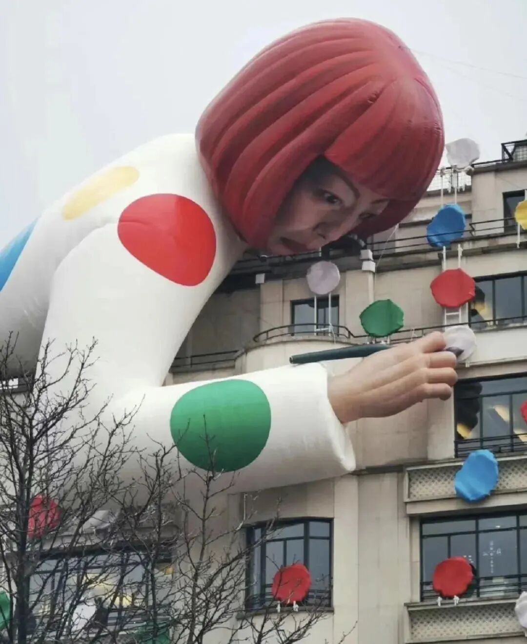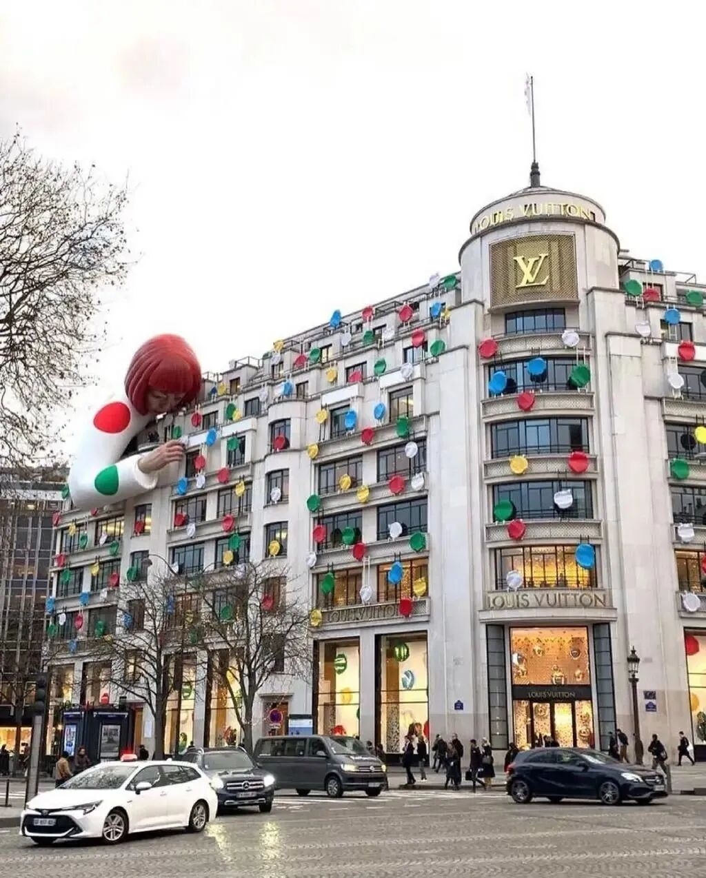 图片中趴在墙上作画的“巨人”,就是“正在给路易威登大楼画波点的草间弥生”。这座典雅建筑的墙面上成了艺术家的画板,被点上了密密麻麻的彩色波点,乍一看颇有节日氛围。但当你走近建筑物,抬头仰望建筑上方巨大的“怪婆婆”充气装置,原本的理智再也压制不了面对可怕巨物时内心最原始的恐惧与焦虑。